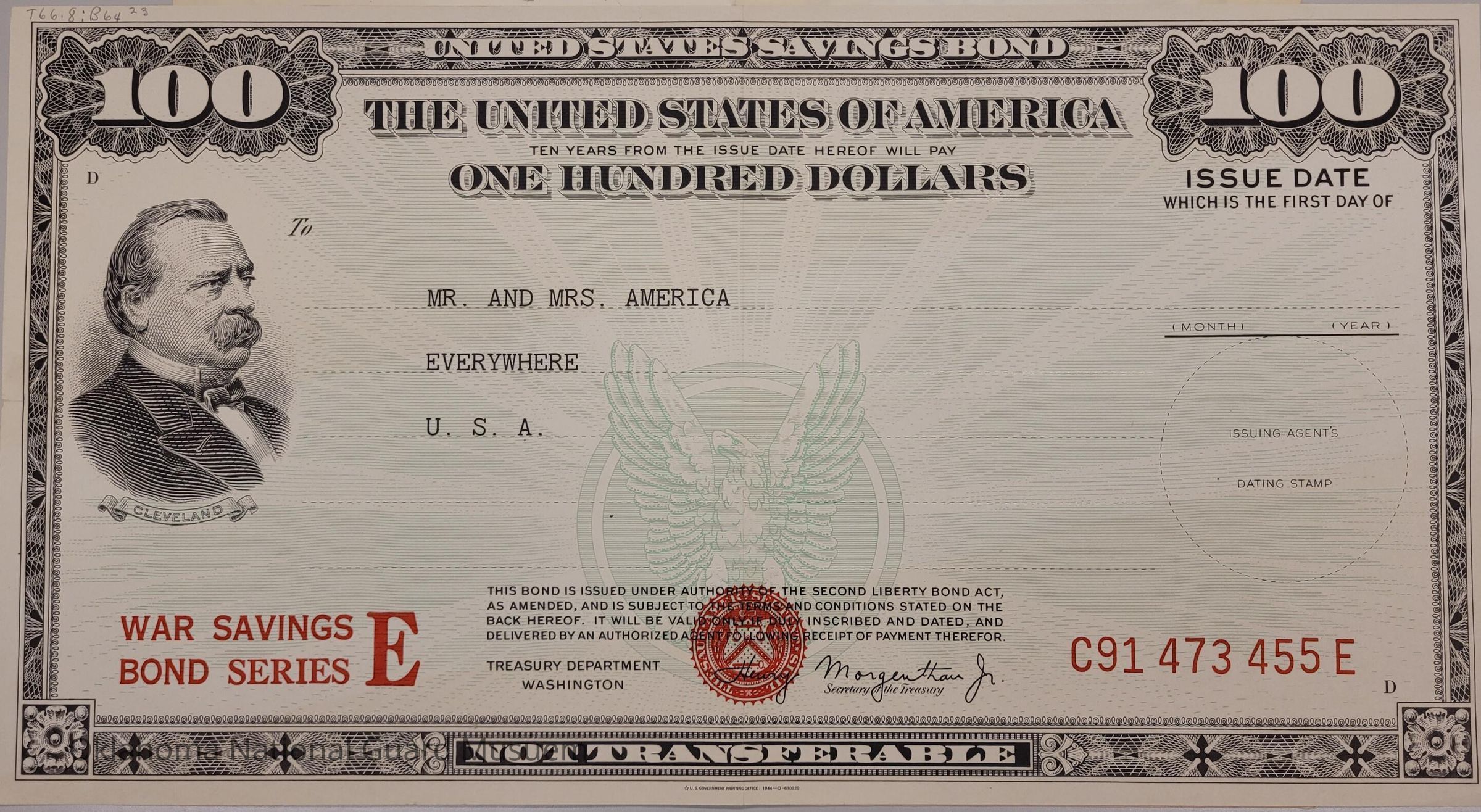 $100 war bond blown up in scale made out to Mr. and Mrs. America