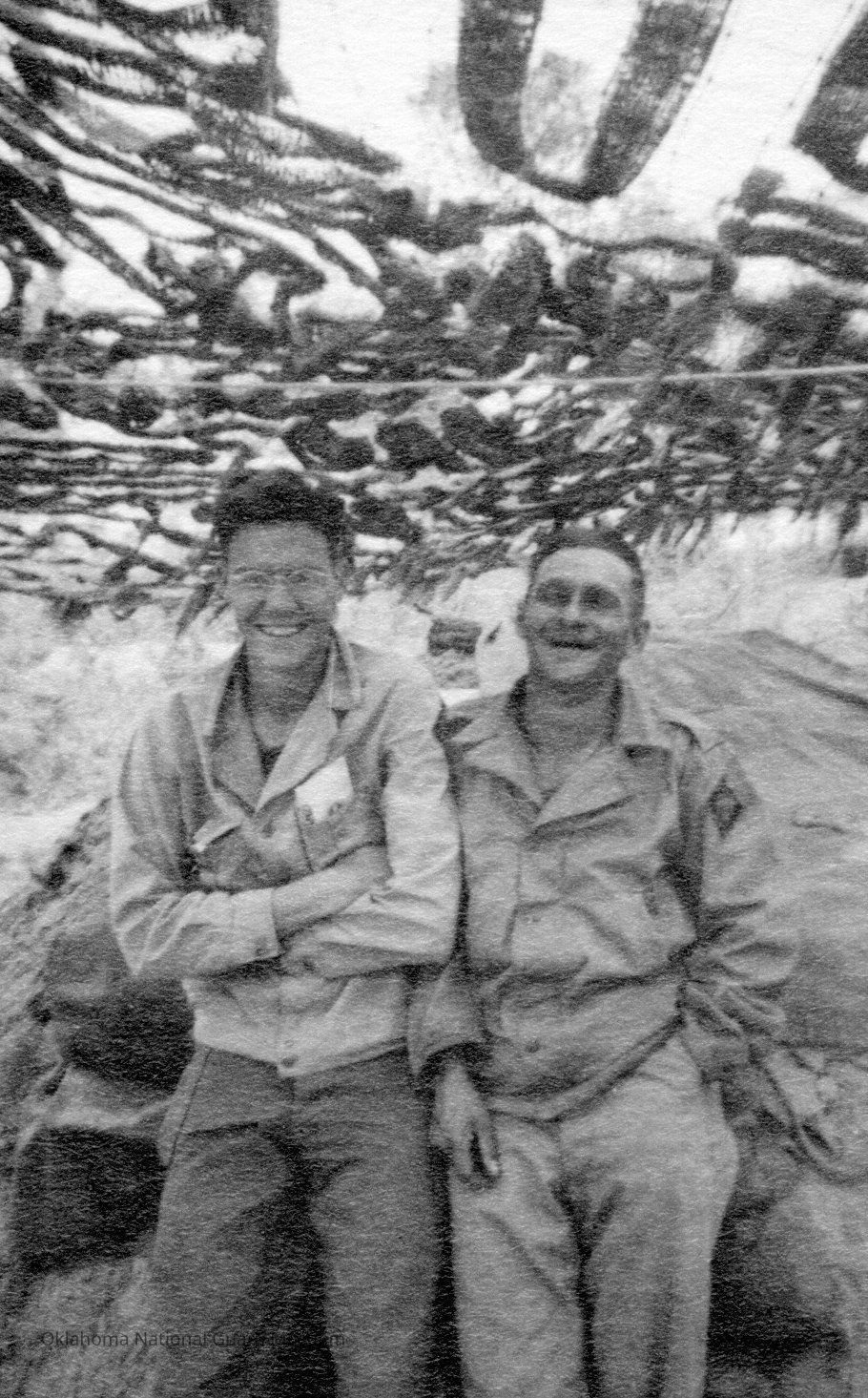 Left to right: Joe Harrison Holiday and William S. (toothsome) Lawrence on the Anzio Beachhead posing in front of the battery's dugout