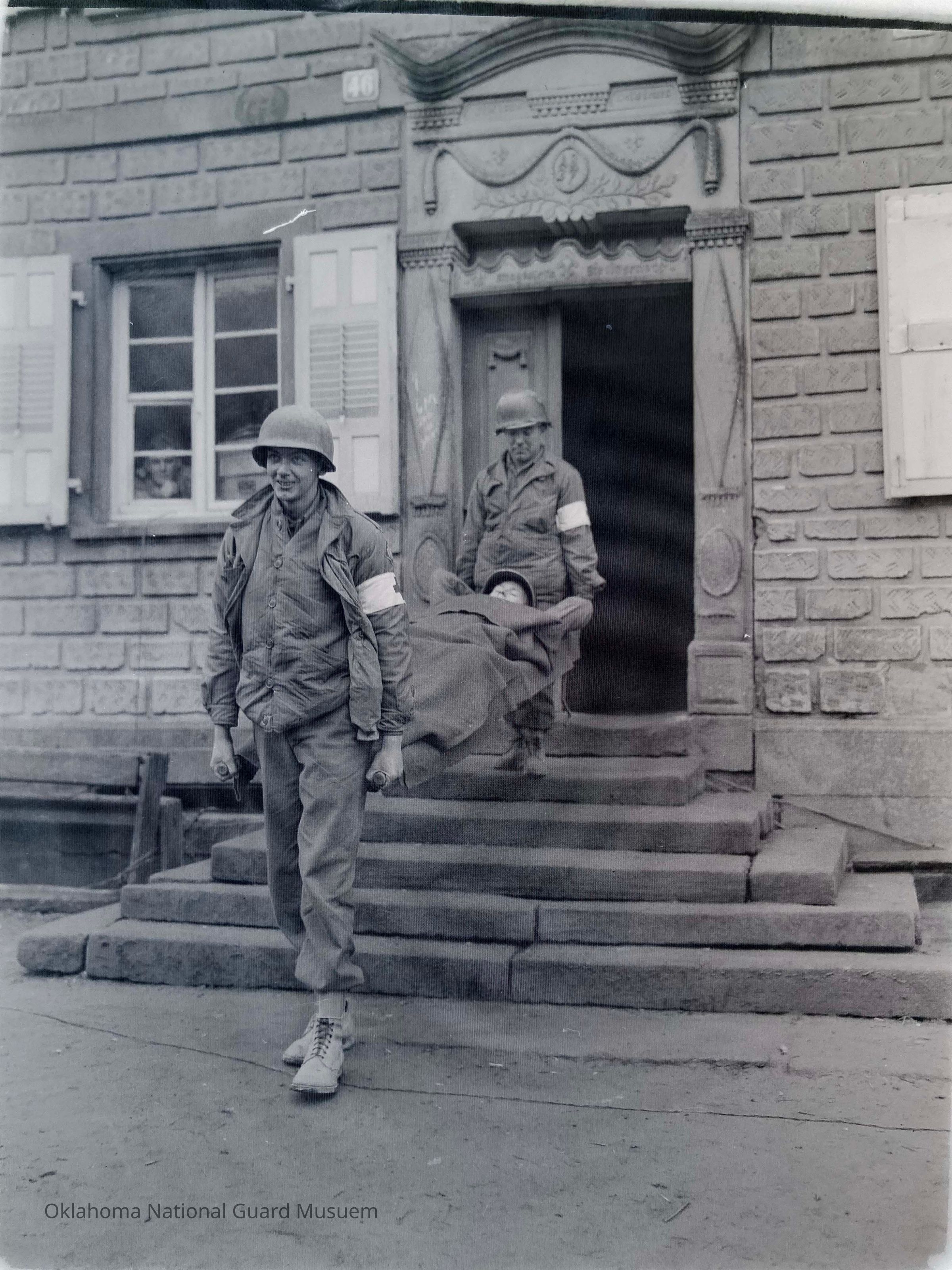 45th Division News Vol. V No. 24 "Down in the 1st Battalion Aid Station 180th Infantry, they call this little contraption "The Mountain Team." Wilson Boyce (Lakewood, Ohio), six-feet-three and Raymond Brown (Chouteau, Oklahoma) five-feet-two operate effectively in the hilly terrain where their varying heights keep their patient on a level plane most of the time coming down a hill. The "patient" here is Charles Stokes (Charleston, West Virginia)"Made/Created