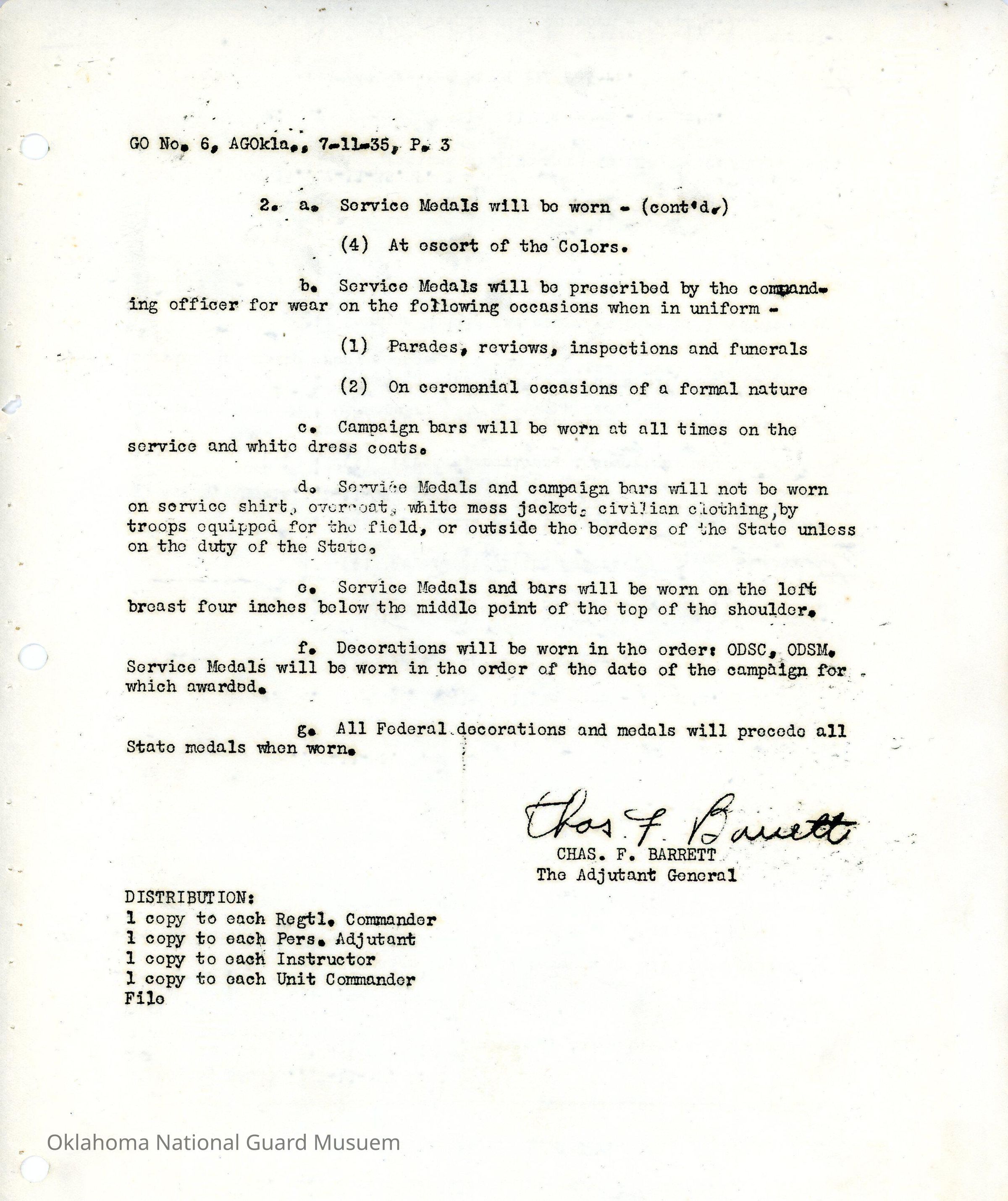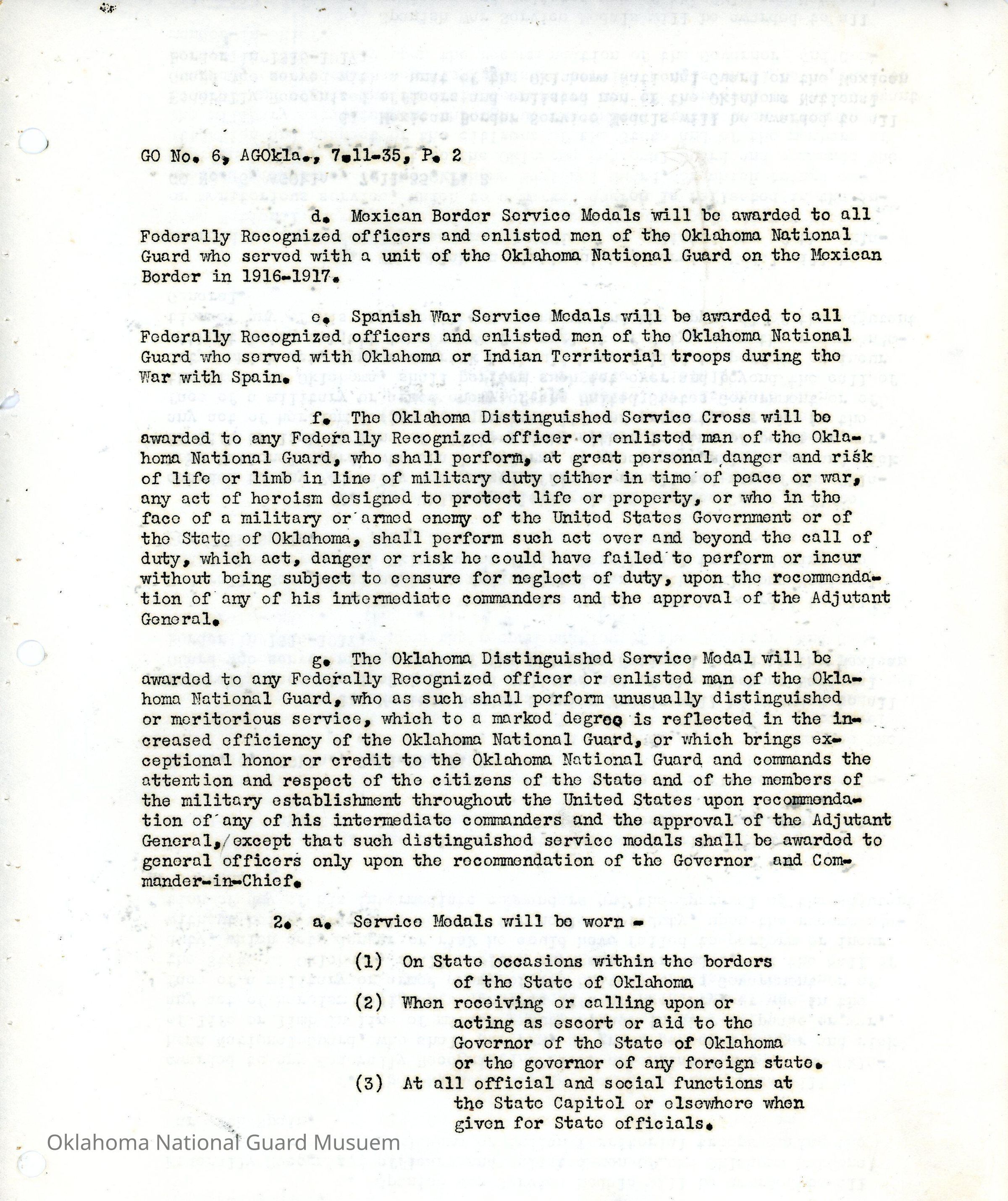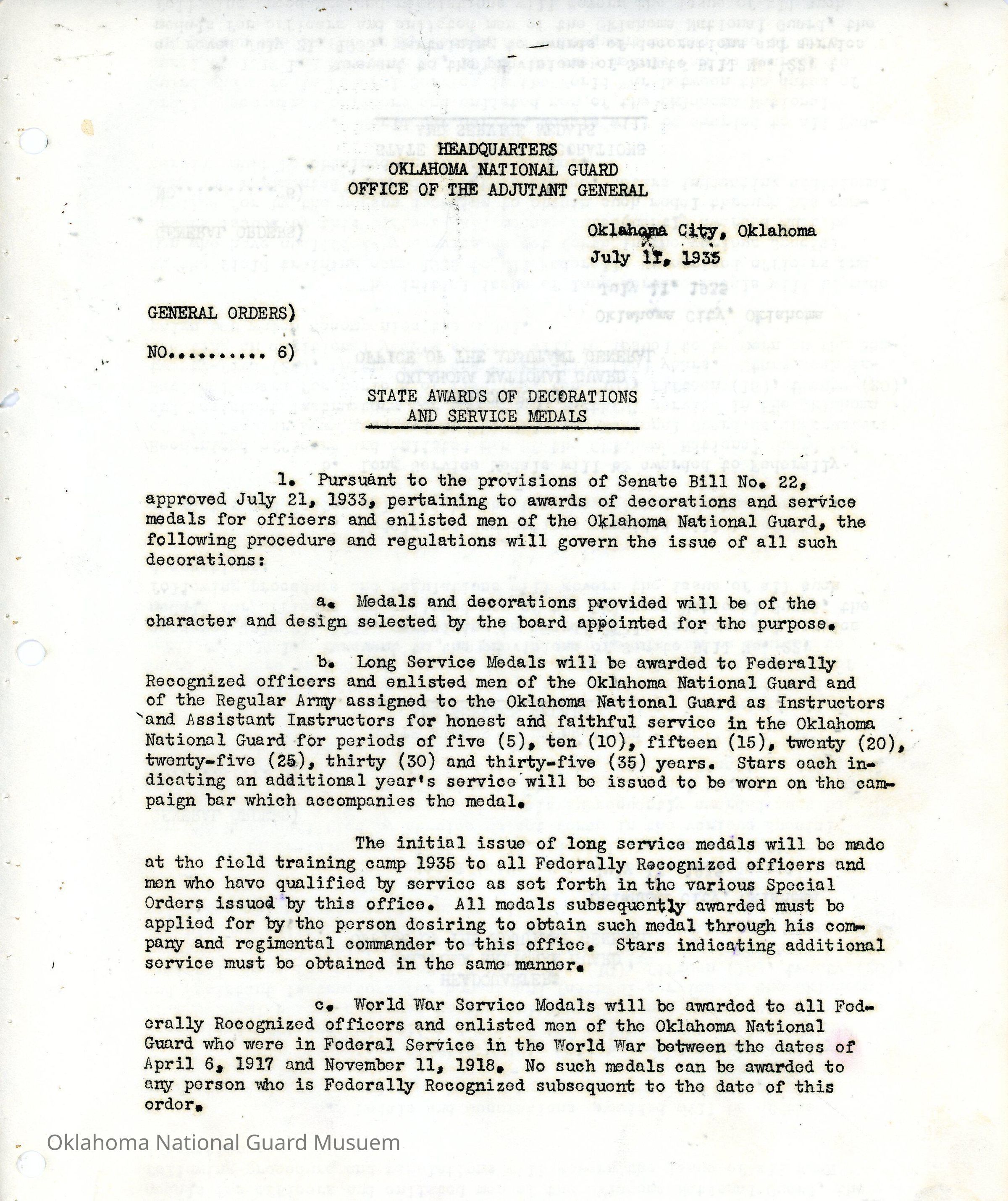 General Order #6 from Headquarters Adjutant General's Office in Oklahoma City. The order details the newly created Oklahoma Distinguished Service Cross, Oklahoma War Service Medal, World War Service Medal, and Long Service MedalsDate(s) of Creation