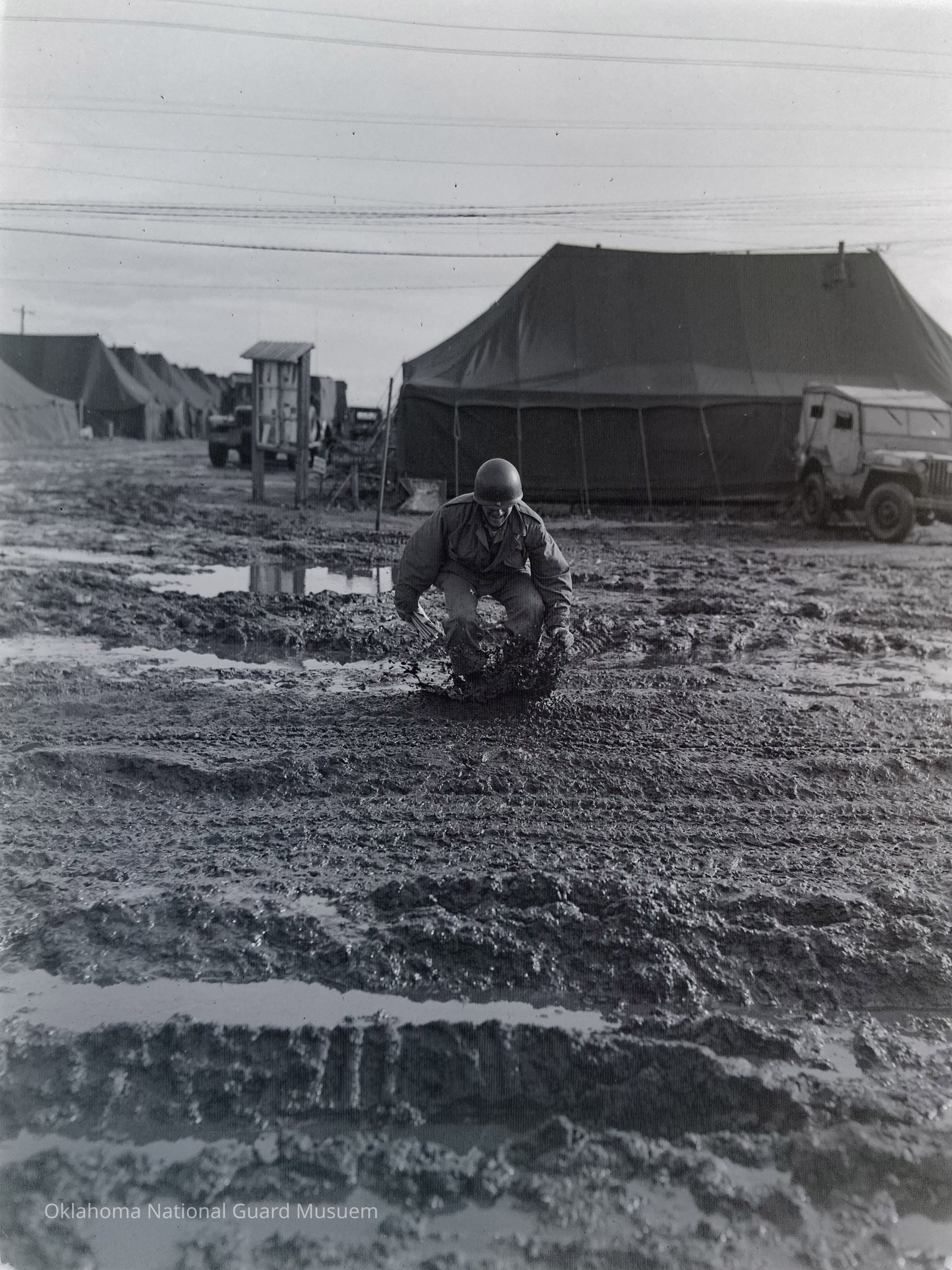 Soldier wading through mud in camp