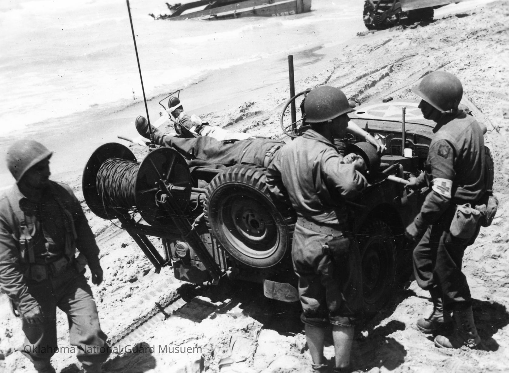 Wounded soldier on Jeep with a spool of communication wire on the back