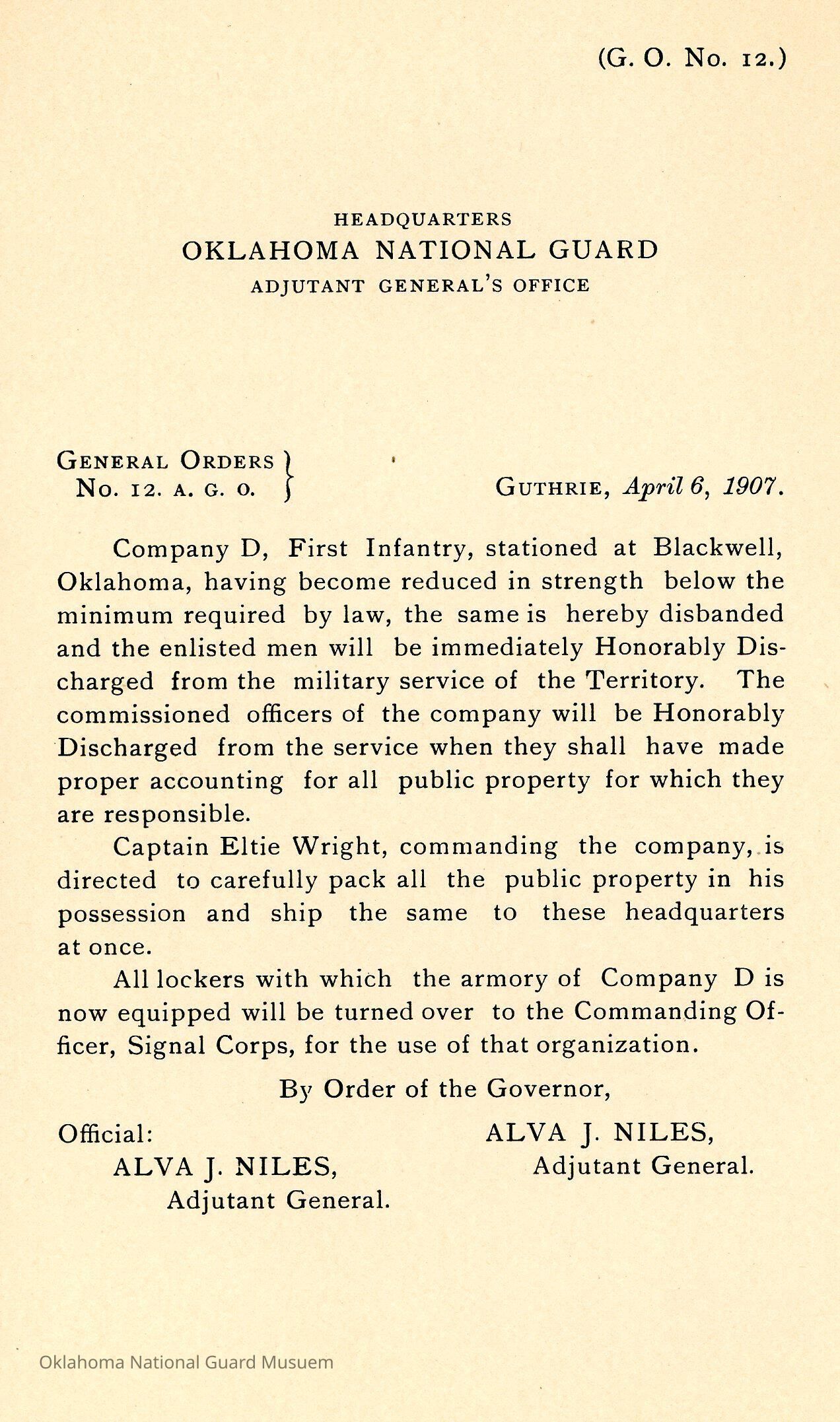 General Order #12 from Headquarters Adjutant General's Office in Guthrie. The order disbands Company D First Infantry stationed in BlackwellDate(s) of Creation