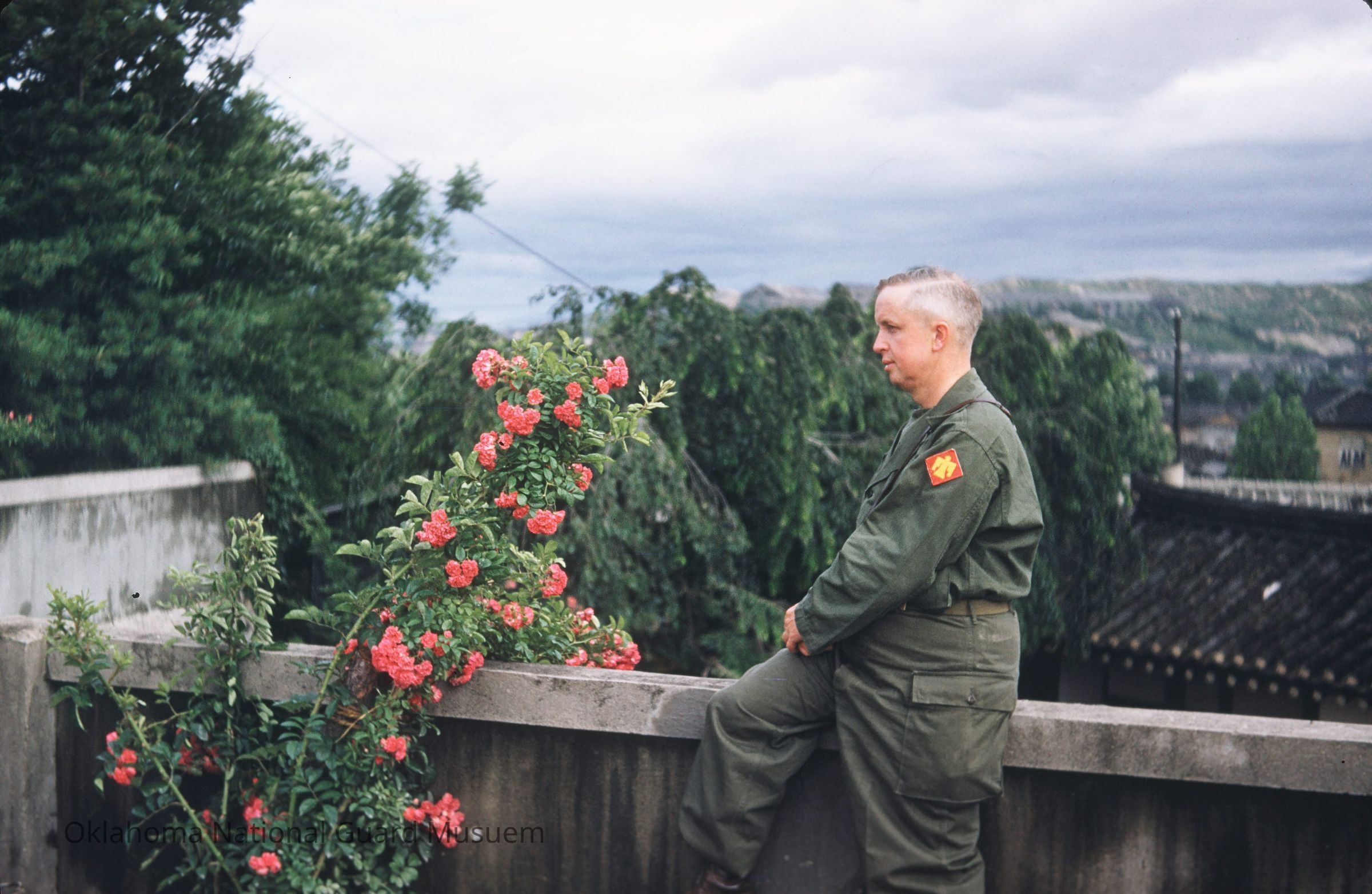Chaplain sitting on ledge next to flowers