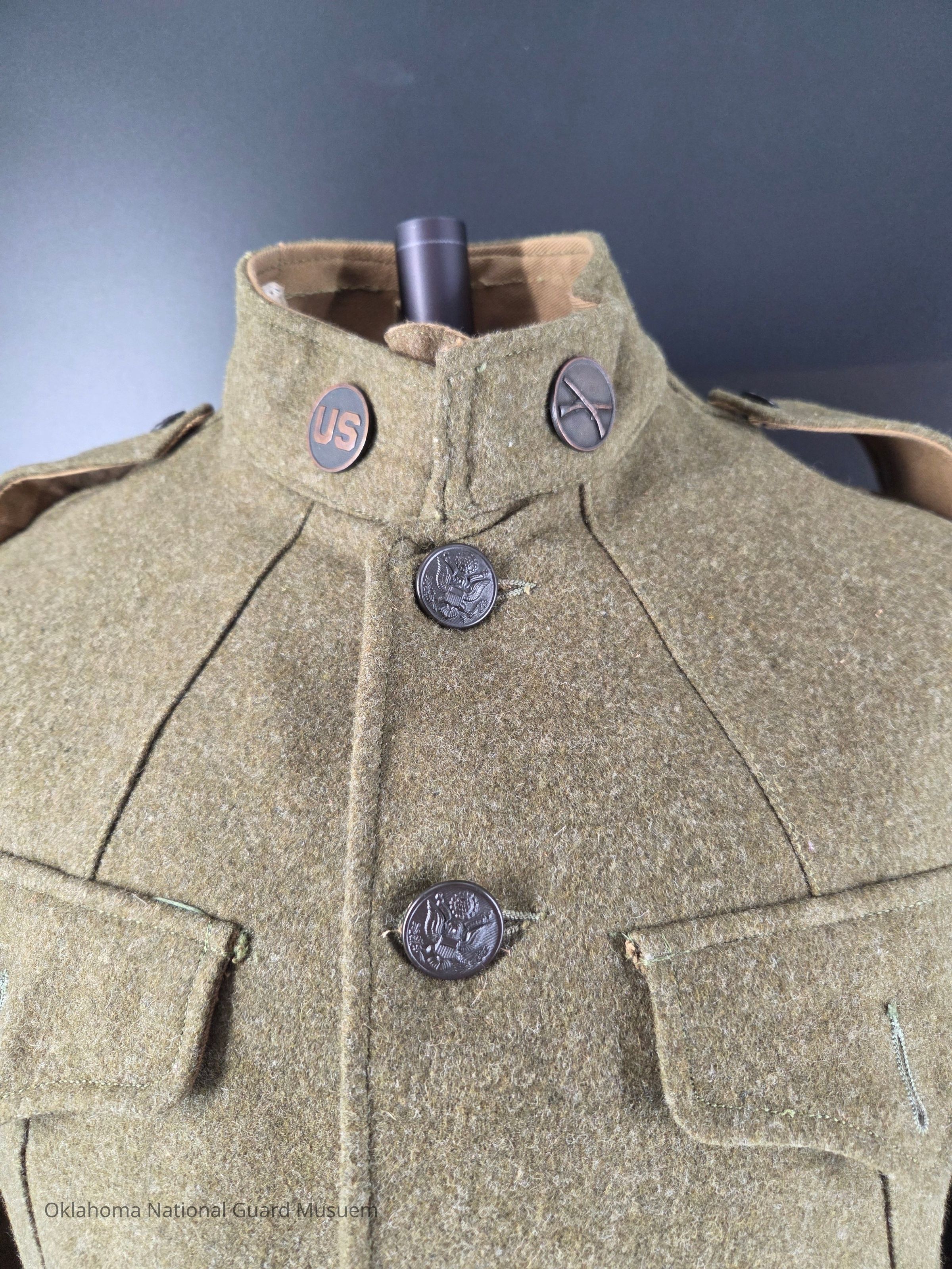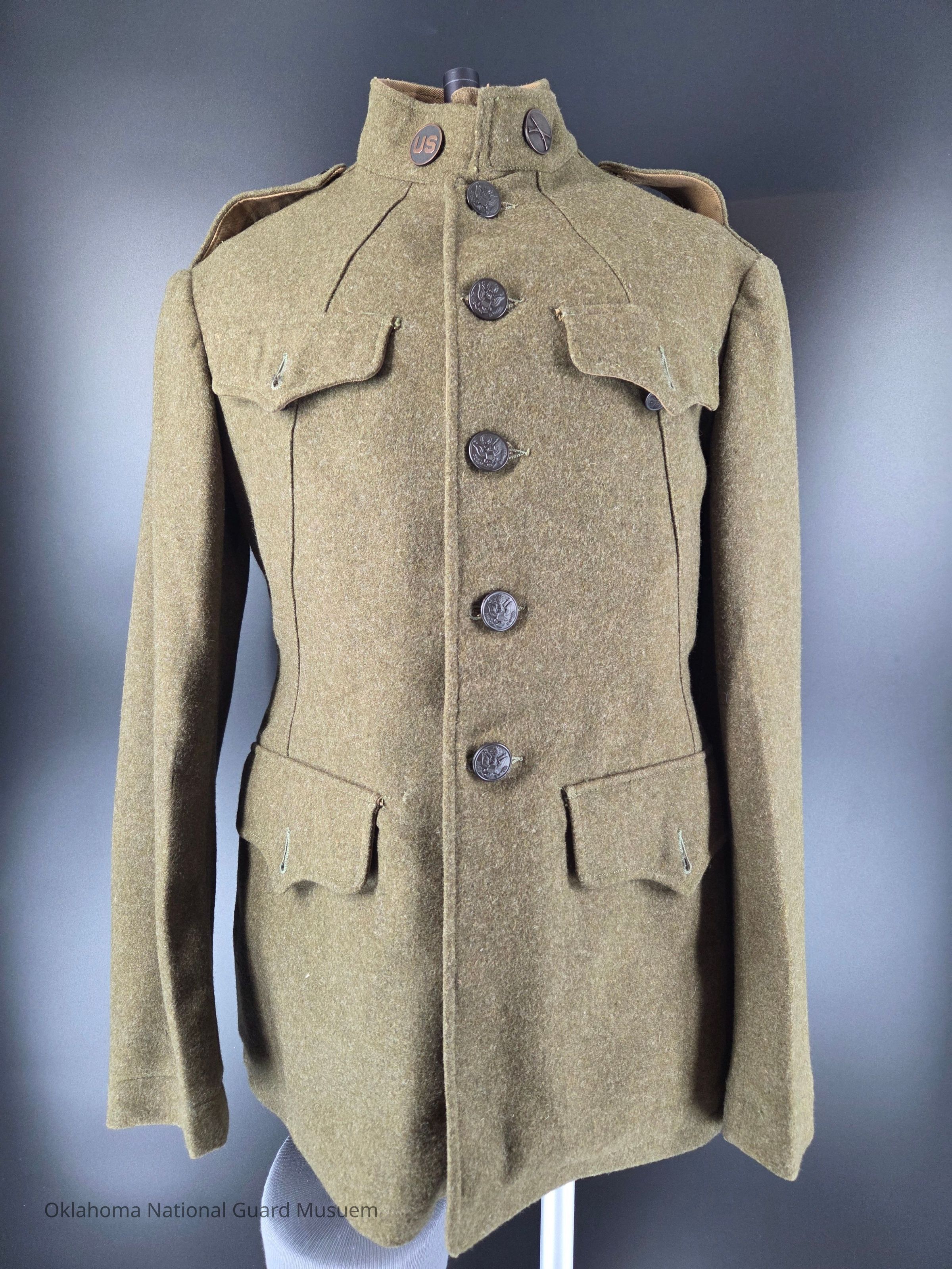 M1917 enlisted man wool tunic. This heavy-duty wool WWI American Army uniform jacket has a full button front, removable buttons, shoulder loops, stand up closed collar with insignia disc holes, four front patch pockets and an interior chest pocket. It is made from a coarser heavier wool.Made/Created