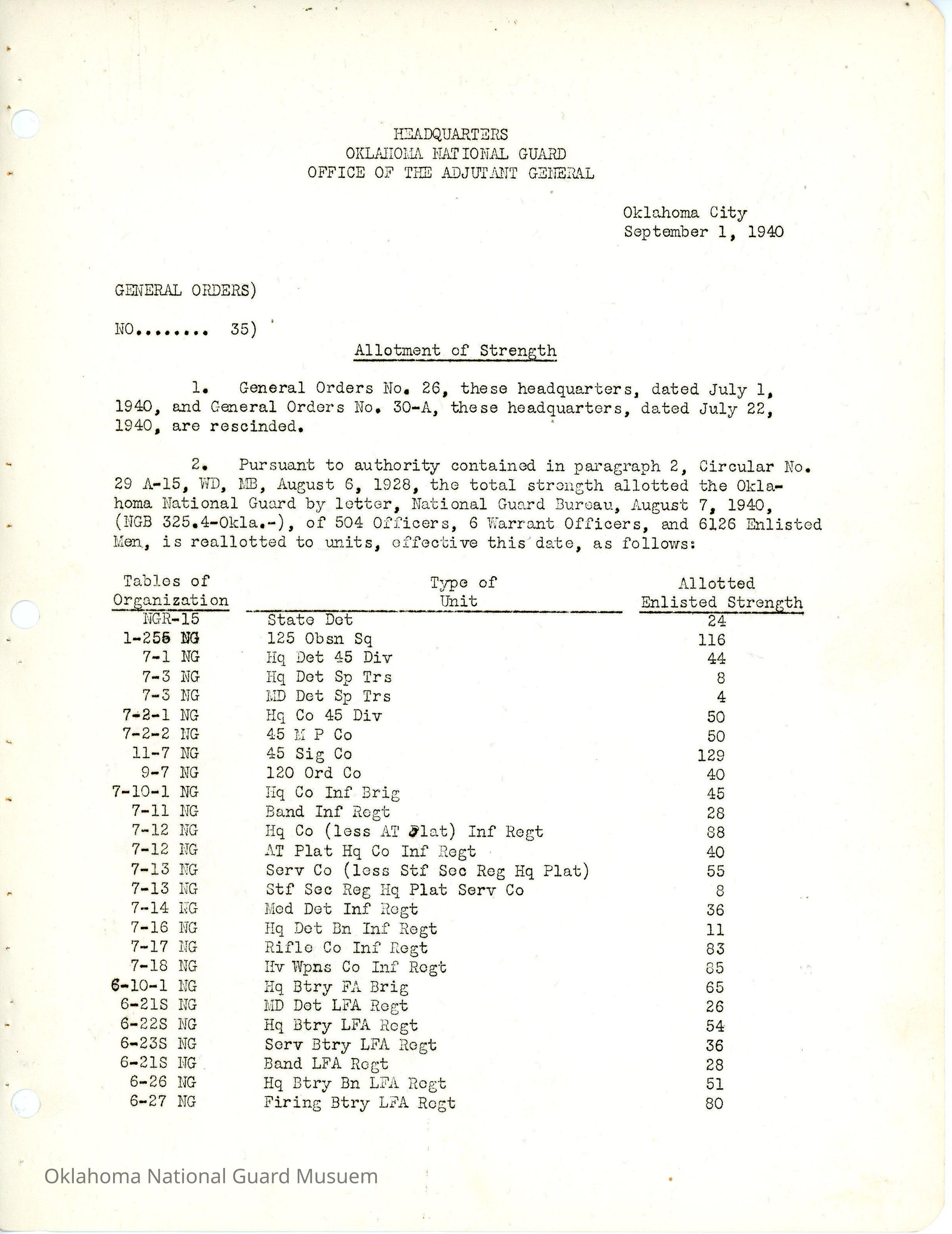 General Order #35 from Headquarters Adjutant General's Office in Oklahoma City. The order rescinds General Order #26 1940 and General Order #30-A 1940 and establishes new strength allotment numbers for the Oklahoma GuardDate(s) of Creation