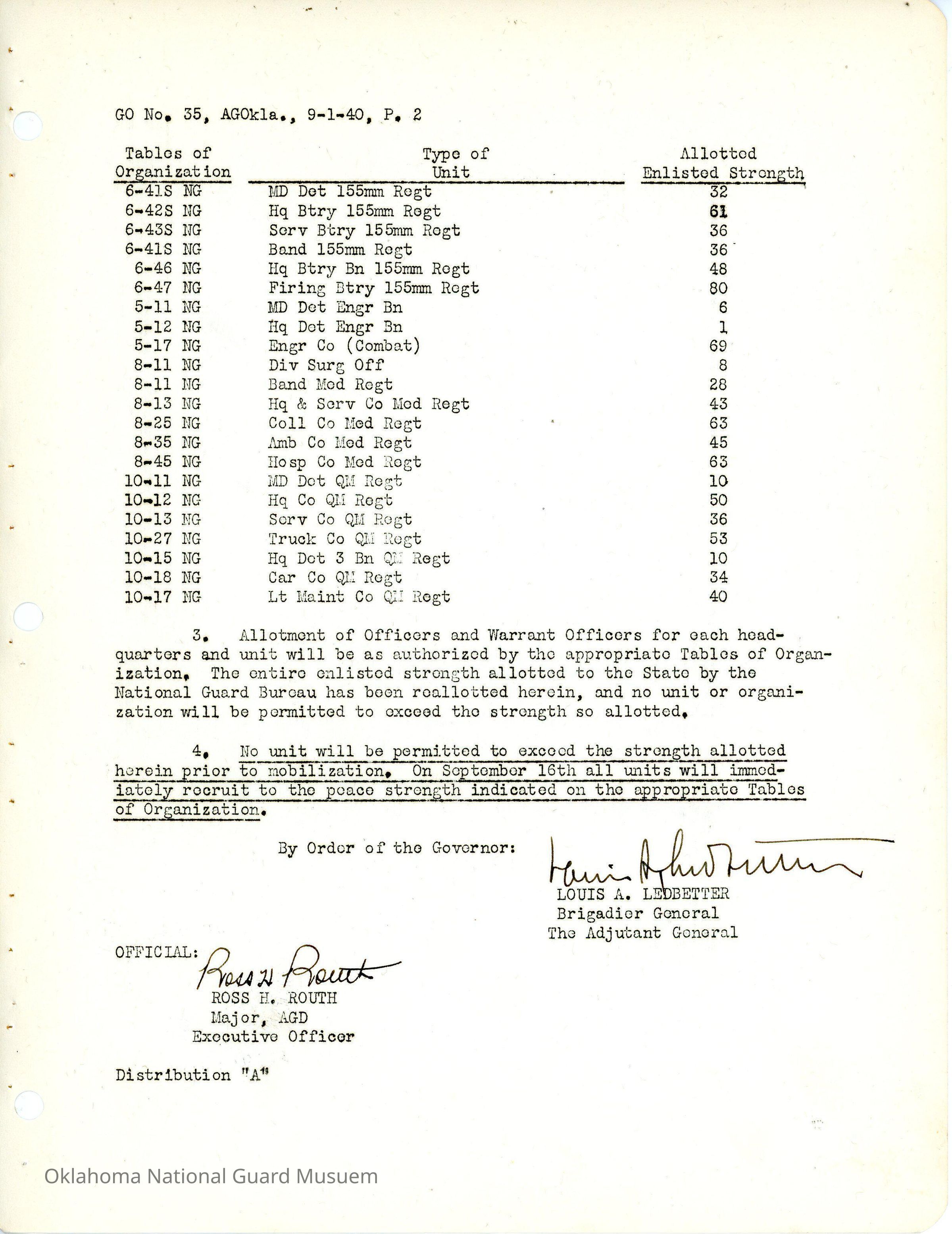 Adjutant General, Oklahoma City, Louis Ledbetter, Ross H. Routh, Rescinds, Allotment of Strength, 45th Division, 90th Infantry Brigade, 179th Infantry, 180th Infantry, 70th Field Artillery Brigade, 158th Field Artillery, 160th Field Artillery, 189th Field Artillery, 120th Engineers, 120th Medical Regiment, 120th Quartermaster Regiment