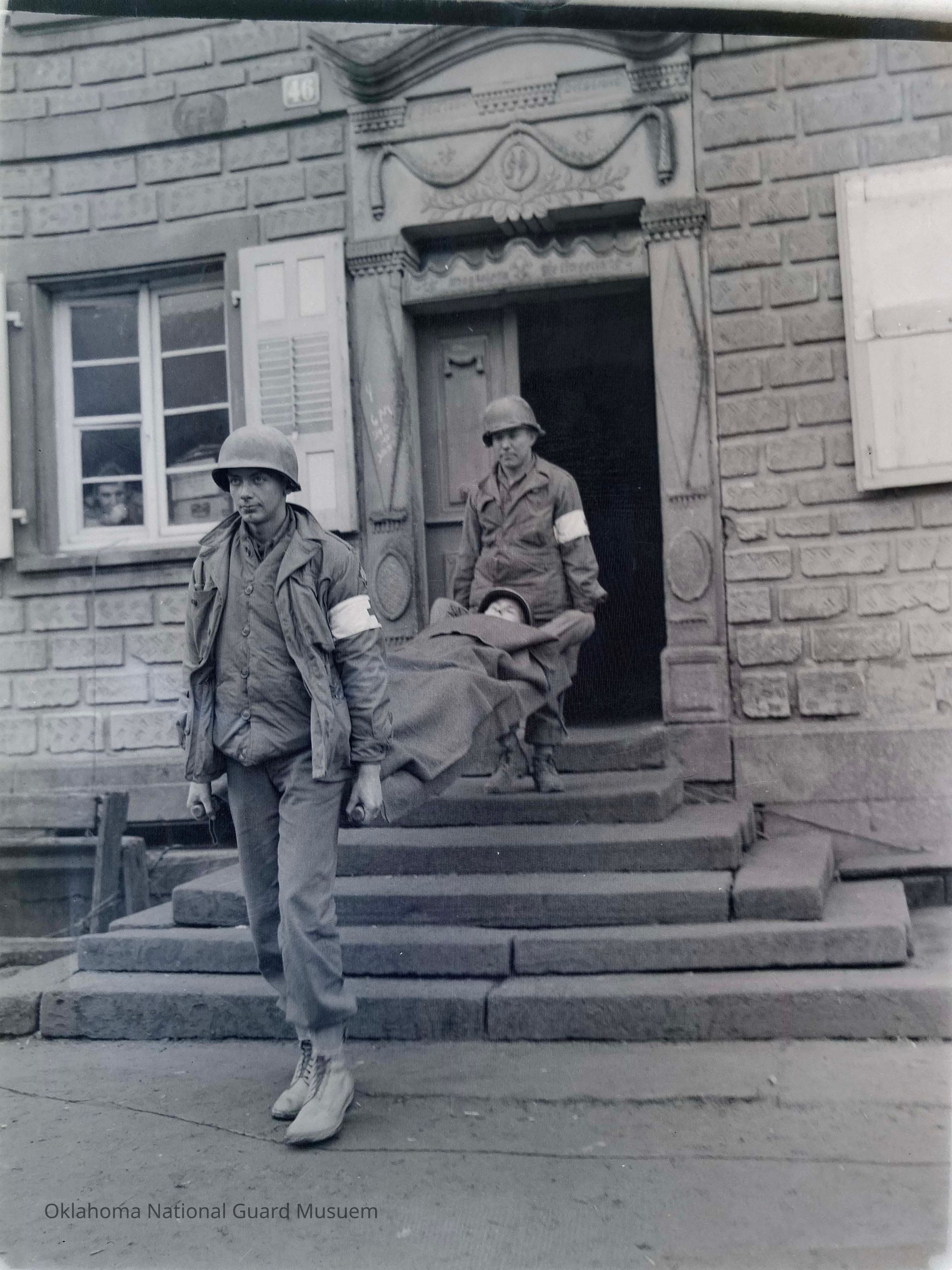 45th Division News Vol. V No. 24 "Down in the 1st Battalion Aid Station 180th Infantry, they call this little contraption "The Mountain Team." Wilson Boyce (Lakewood, Ohio), six-feet-three and Raymond Brown (Chouteau, Oklahoma) five-feet-two operate effectively in the hilly terrain where their varying heights keep their patient on a level plane most of the time coming down a hill. The "patient" here is Charles Stokes (Charleston, West Virginia)"Made/Created