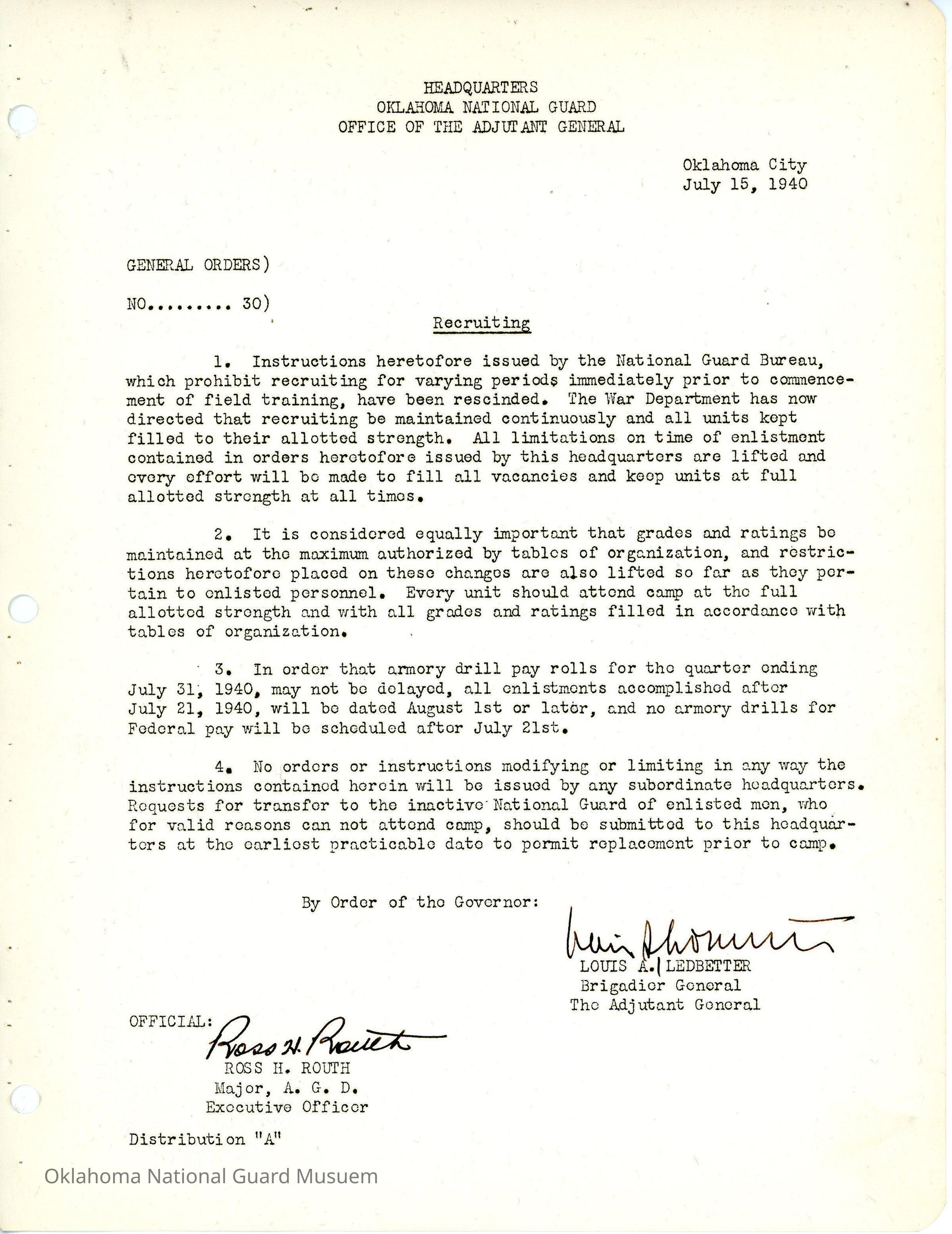 Adjutant General, Oklahoma City, Louis A. Ledbetter, Ross H. Routh, Strength, Pay rolls, Vacancies, Recruiting