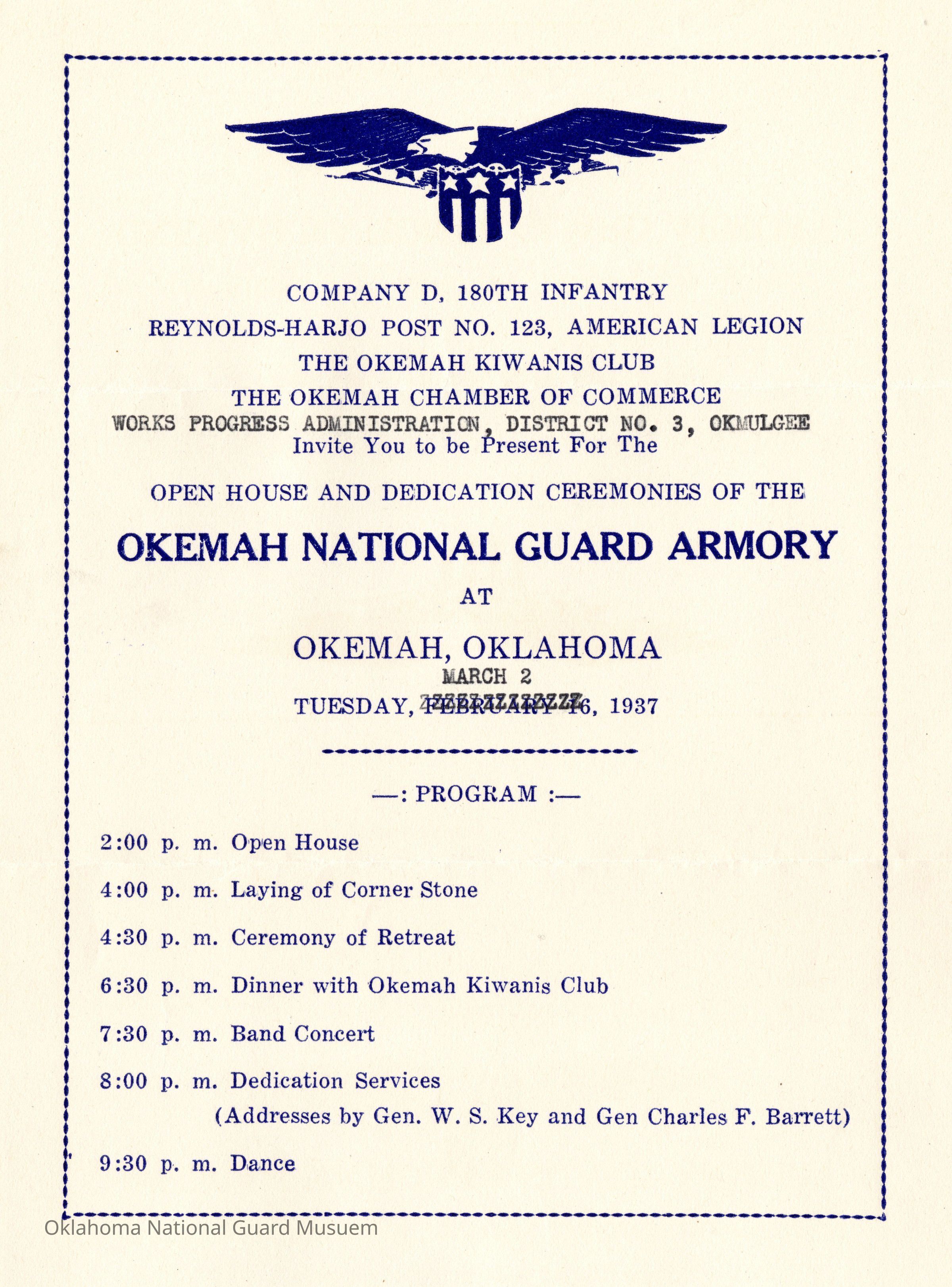 Dedication program for the armory in Okemah. Company D 180th Infantry