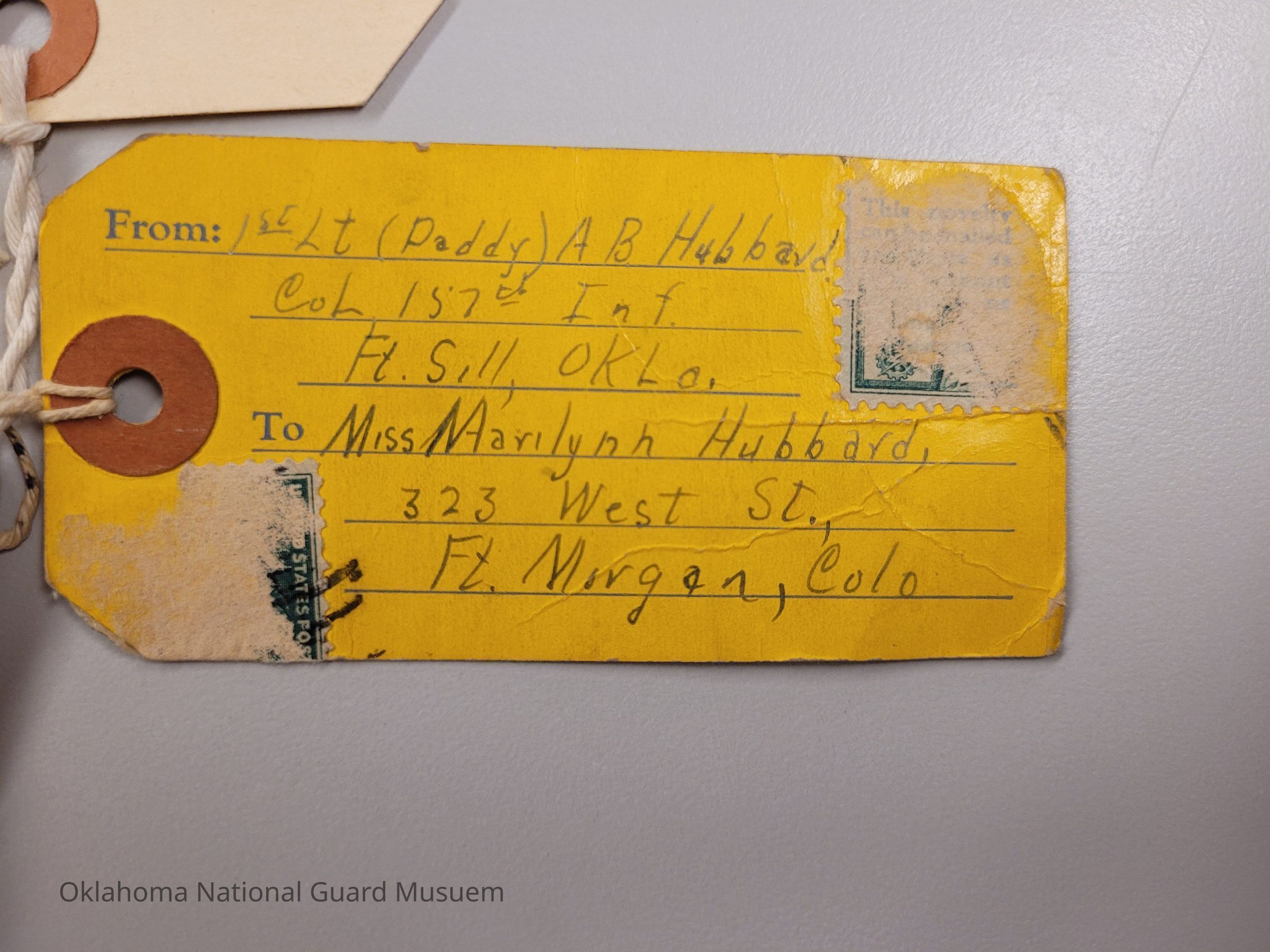 From: 1st Lt. (Daddy) AB Hubbard Company L 157th Infantry Ft. Sill, Oklahoma To: Miss Marilynn Hubbard 323 West St. Ft. Morgan, Colorado