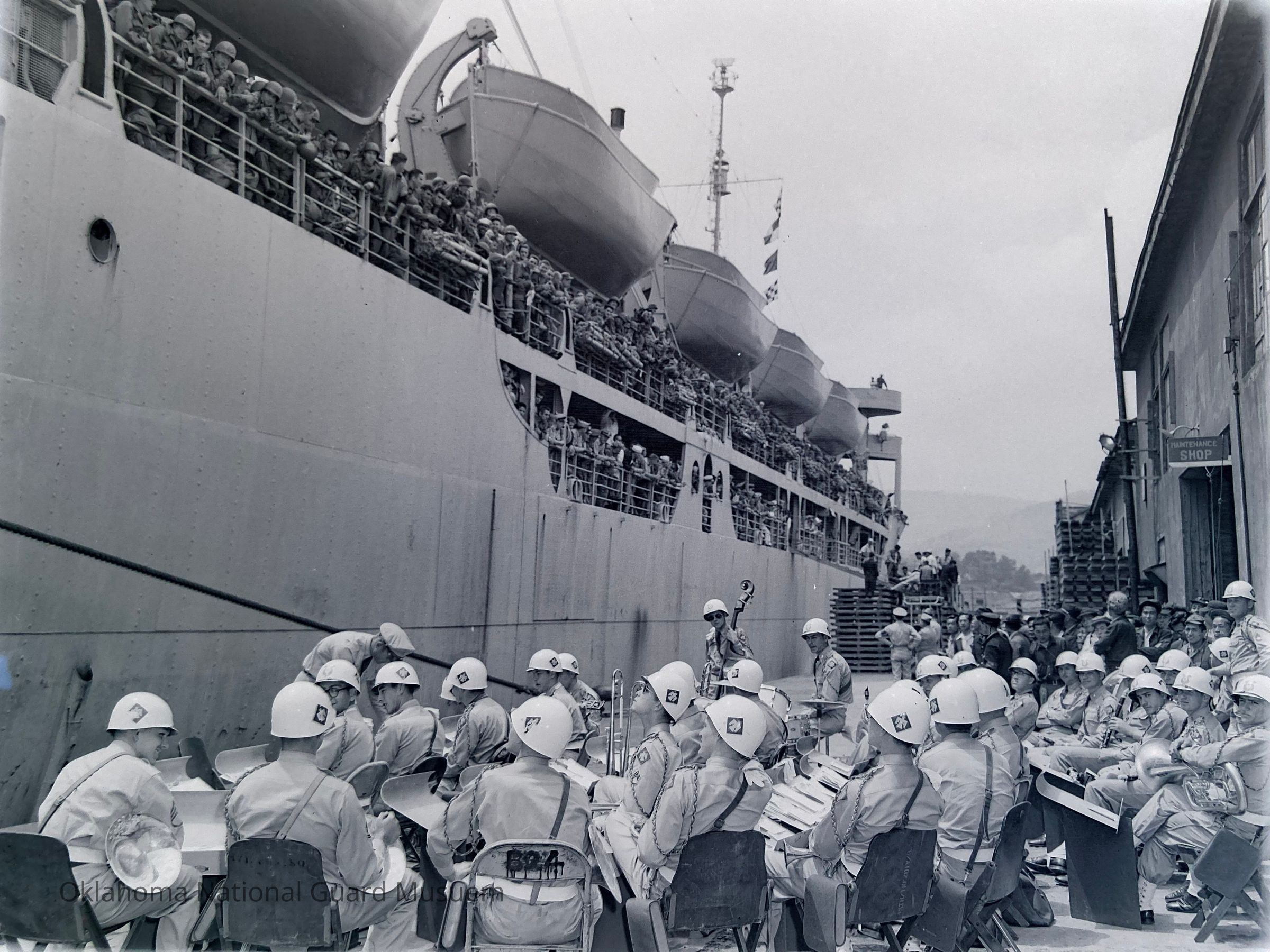 45th Division Band at dockside playing for troops onboard a ship