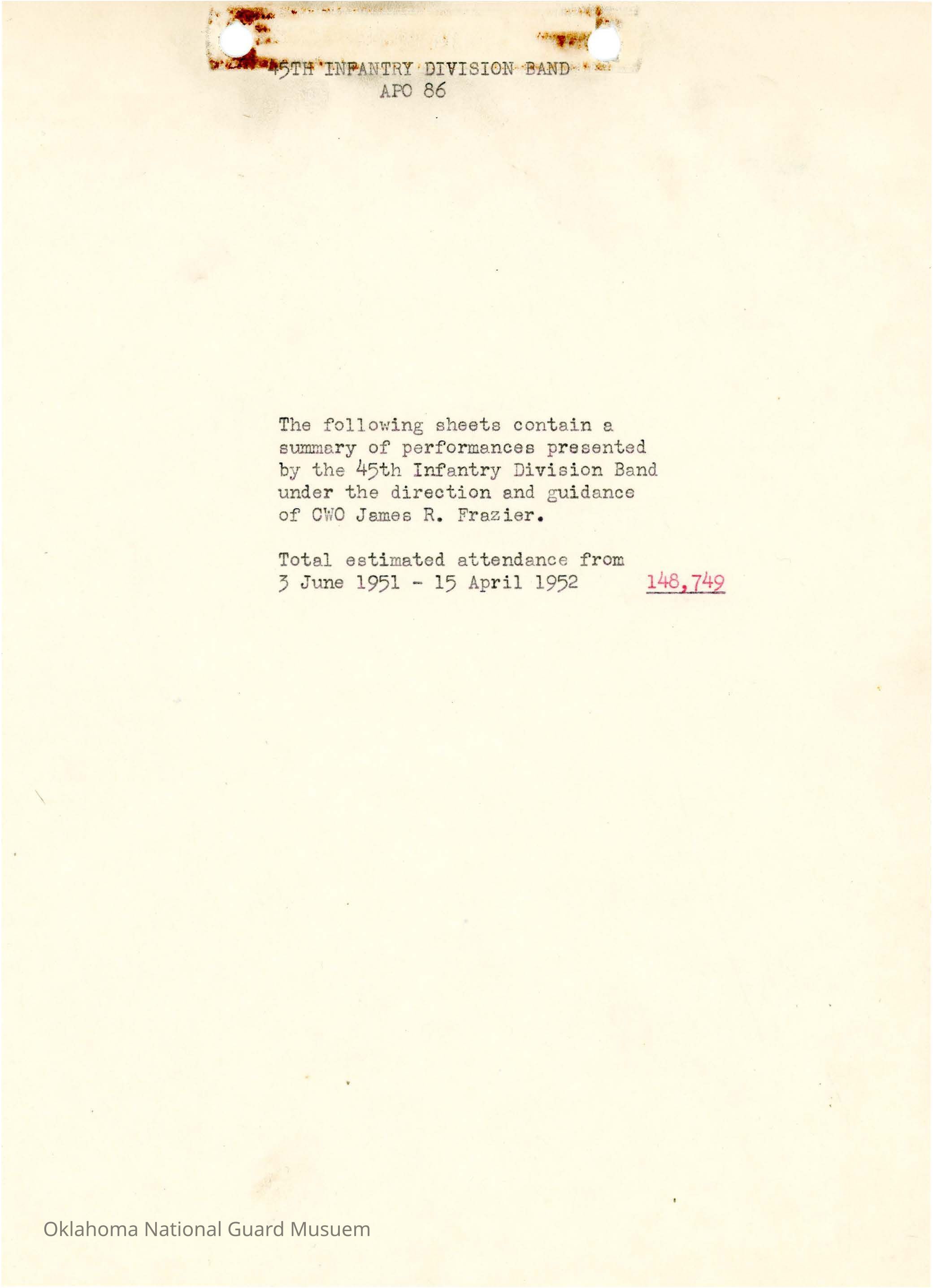 45th Division Band Performance List during training on Hokkaido and in Korea