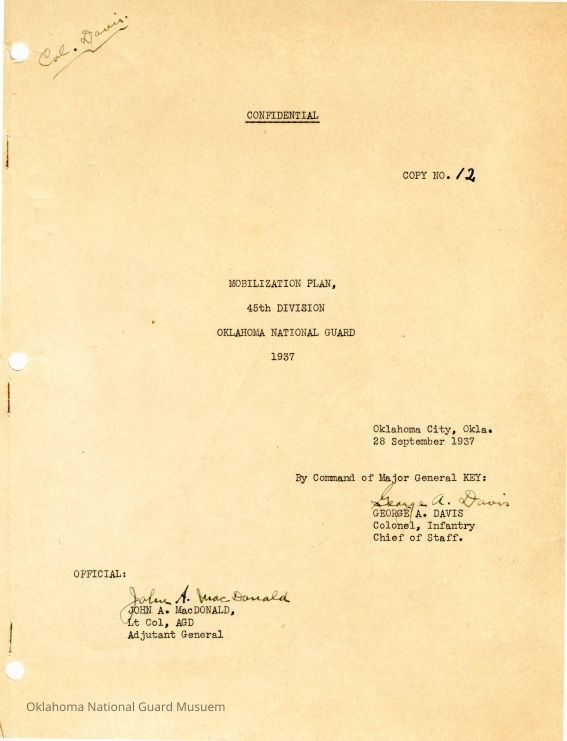 George A. Davis' copy of the 1937 Division Mobilization Plan. This plan details the steps involved in getting the 45th Division mobilized in the event of federalization