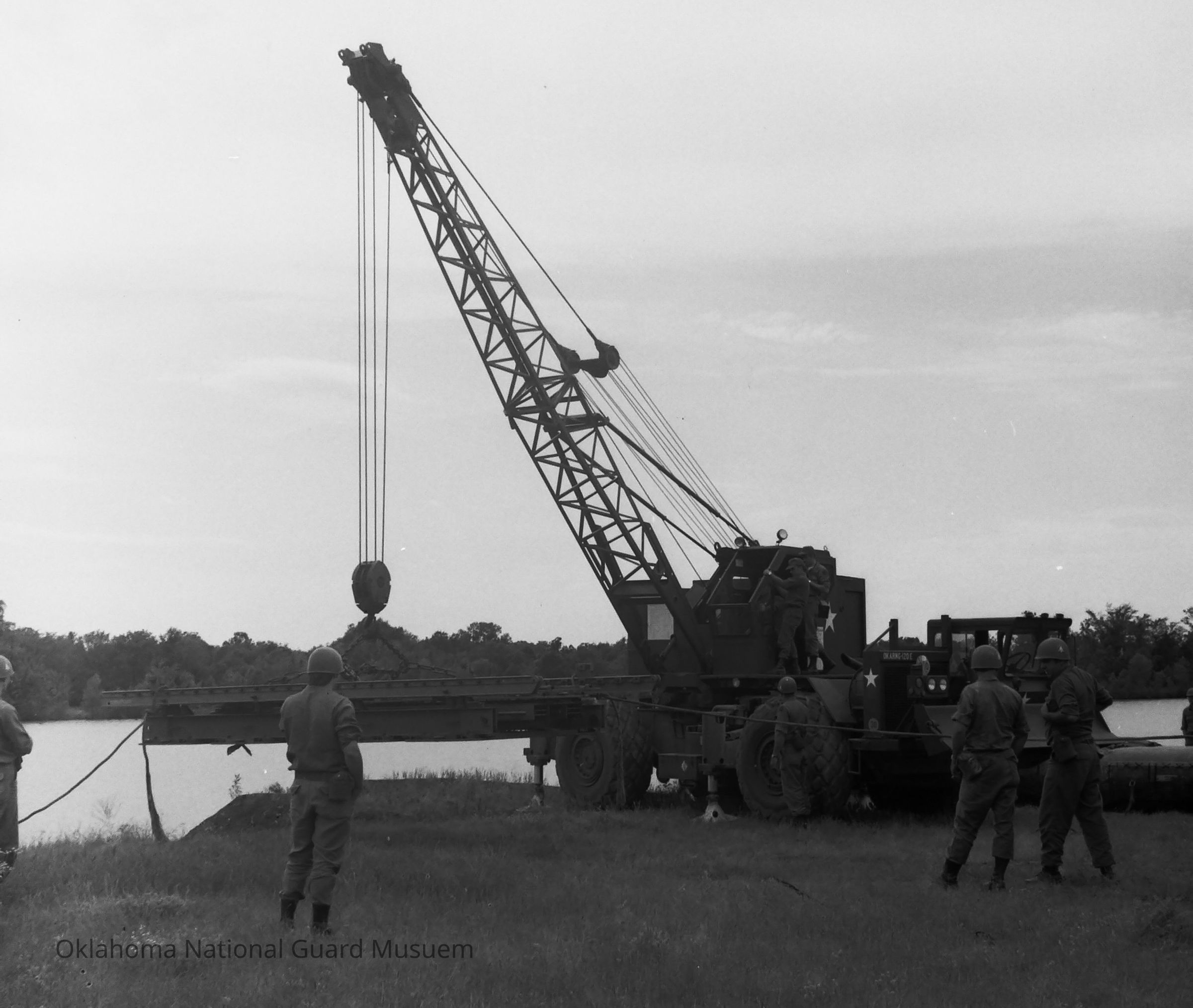 Negative of soldiers training to construct a pontoon bridge. 120th Engineers