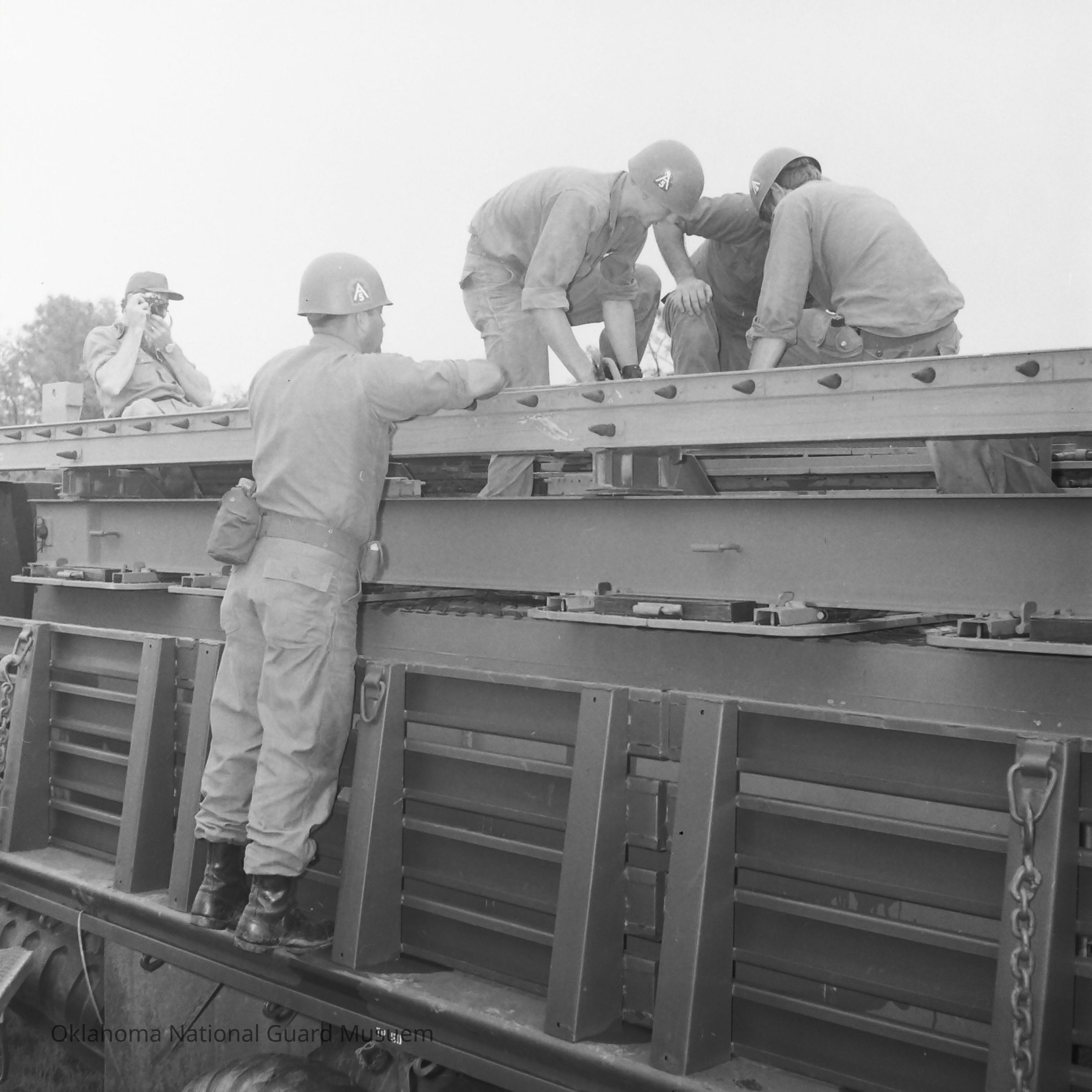 Negative of soldiers training to construct a pontoon bridge. 120th Engineers