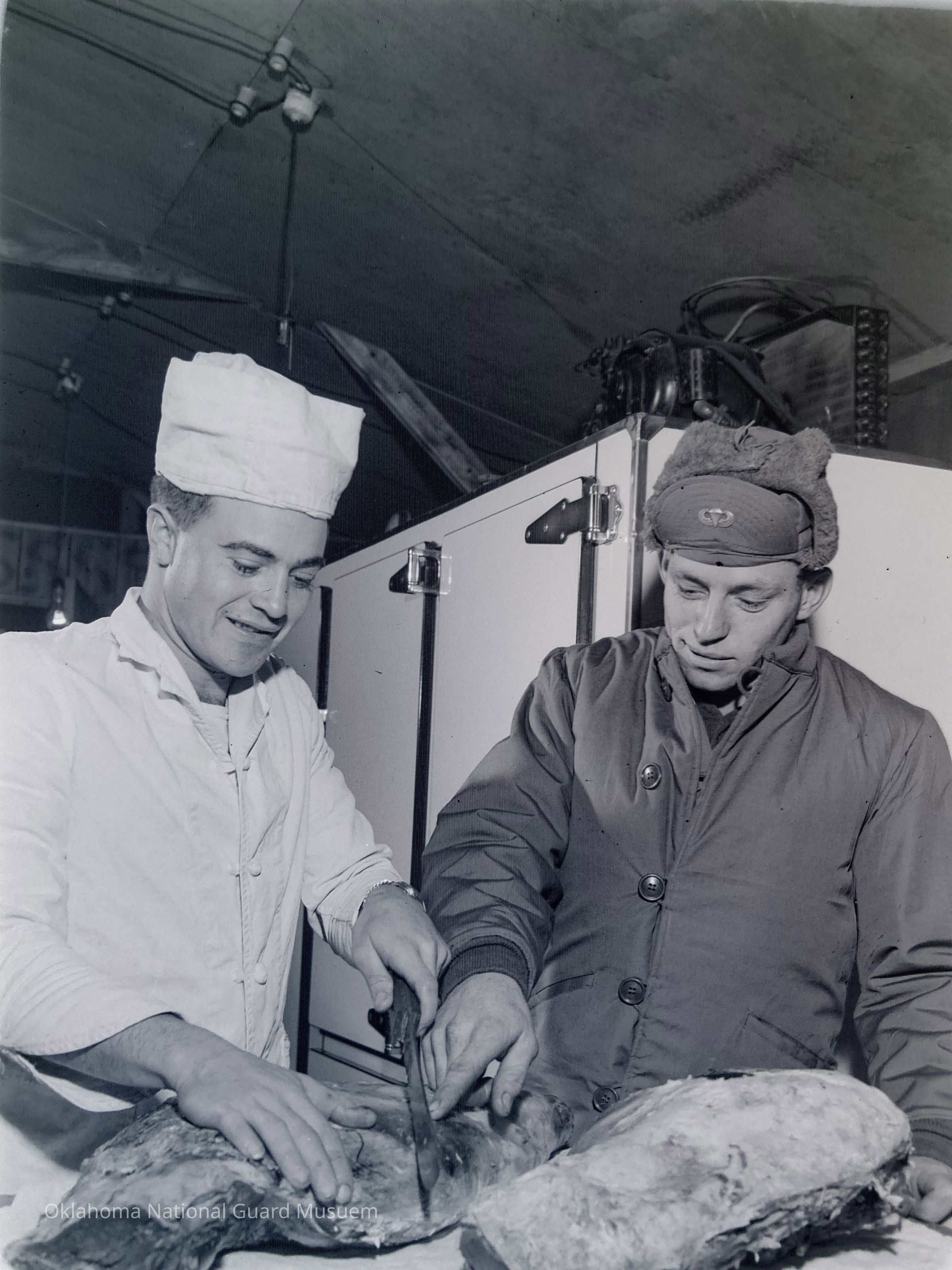 Cook and a soldier preparing food in a kitchen