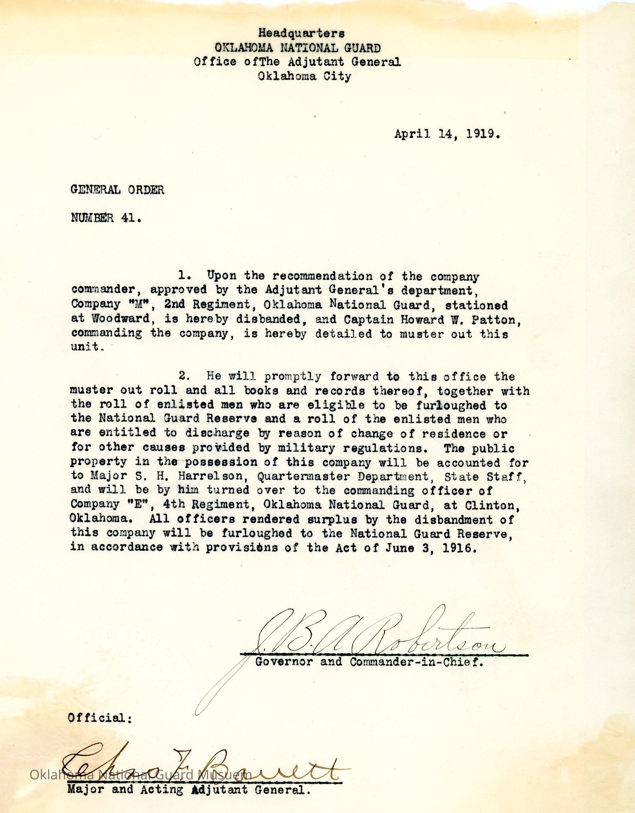 General Order #41 from Headquarters Adjutant General's Office in Oklahoma City. The order disbands Company M of the Second Regiment at Woodward. Howard W. Patton is mustered out of the unit. The public property of the unit will be accounted for by S.H. Harrelson.Date(s) of Creation