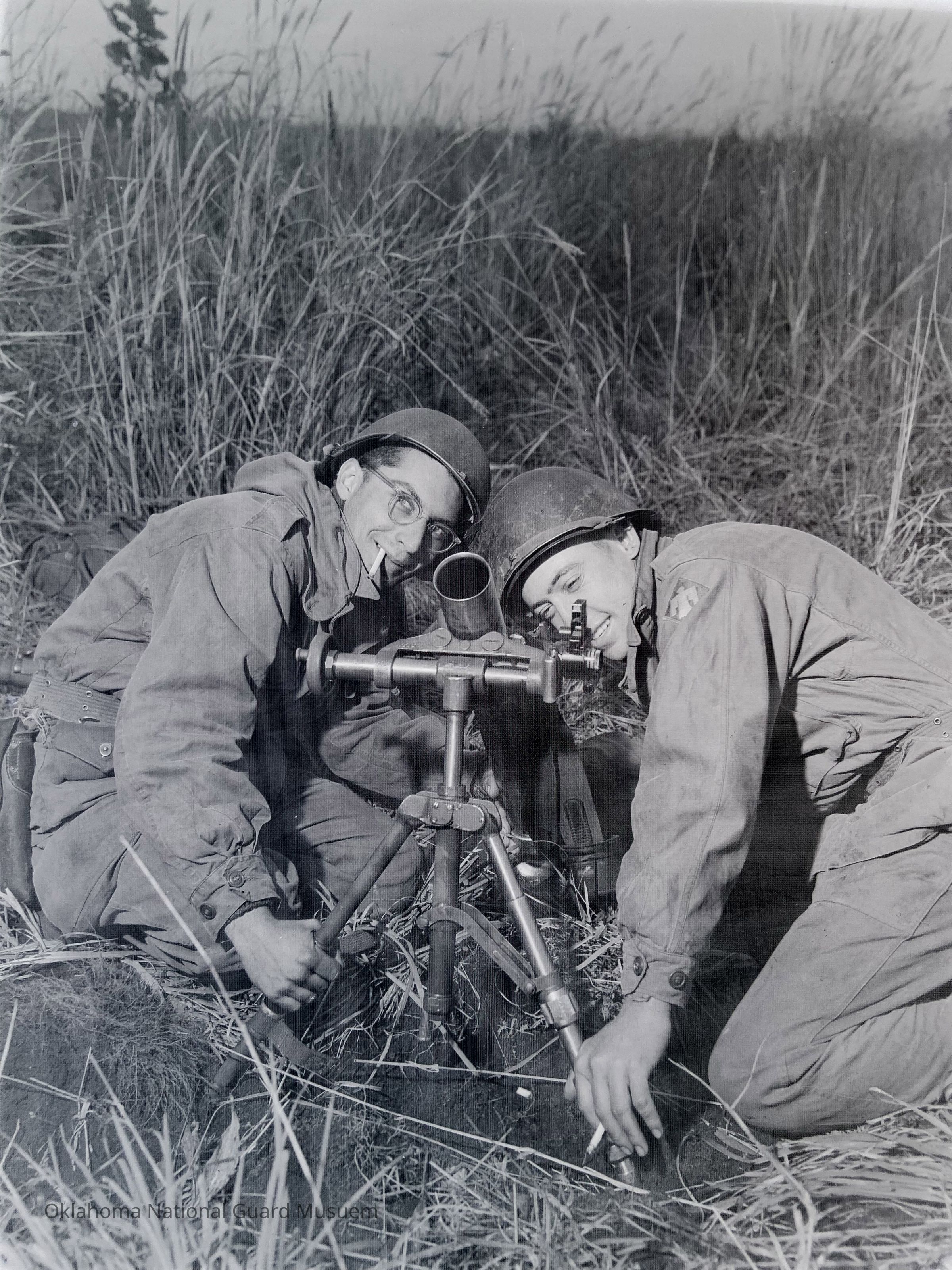 Negative of soldiers sighting a 60mm mortar on Hokkaido, Japan