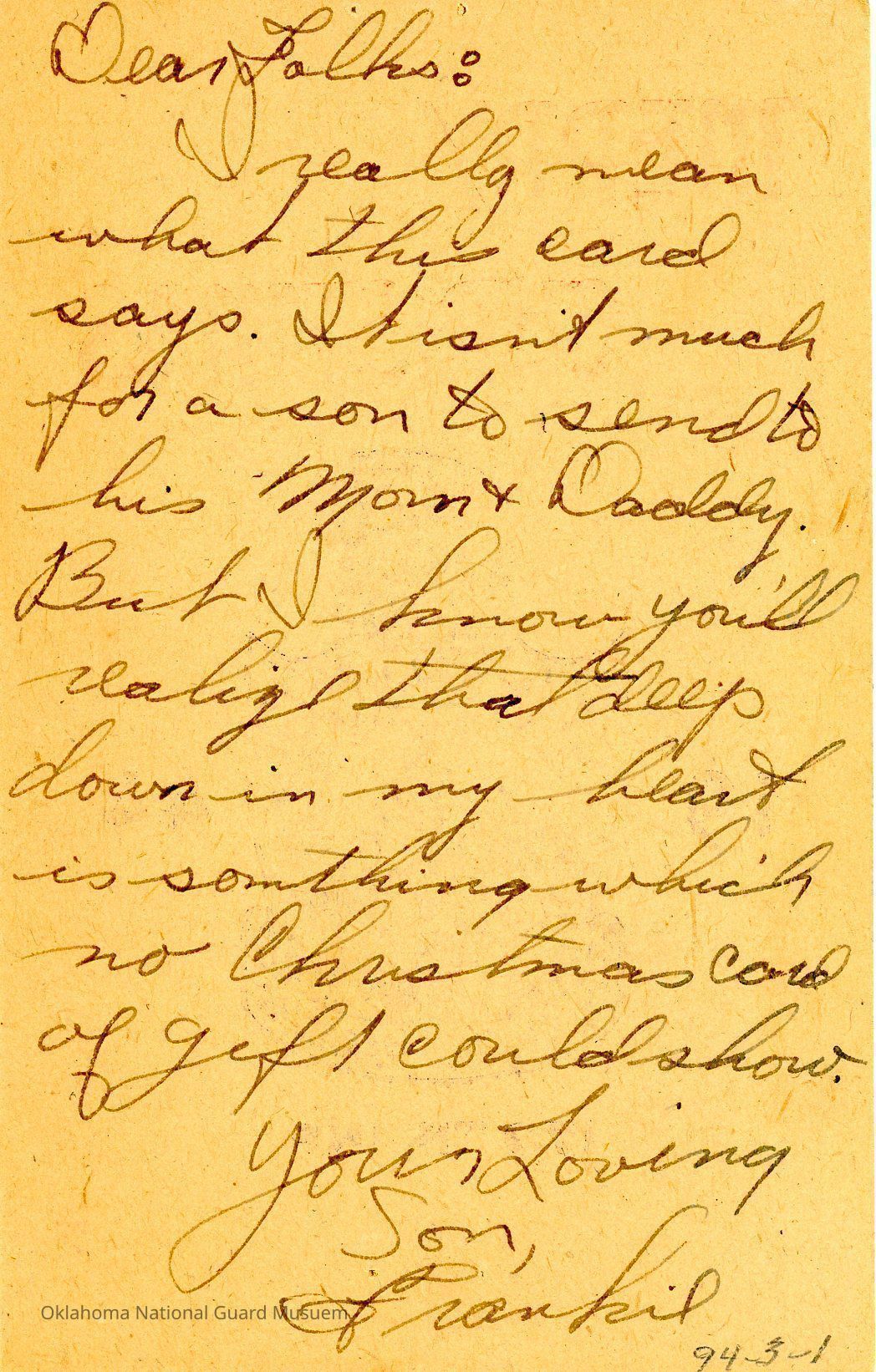 Dear Folks: I really mean what this card says. It isn't much for a son to send to his Mom and Daddy. But, I know you'll [illegible] that deep down in my heart is something which no Christmas card or gift could show. Your Loving Son, Frankie