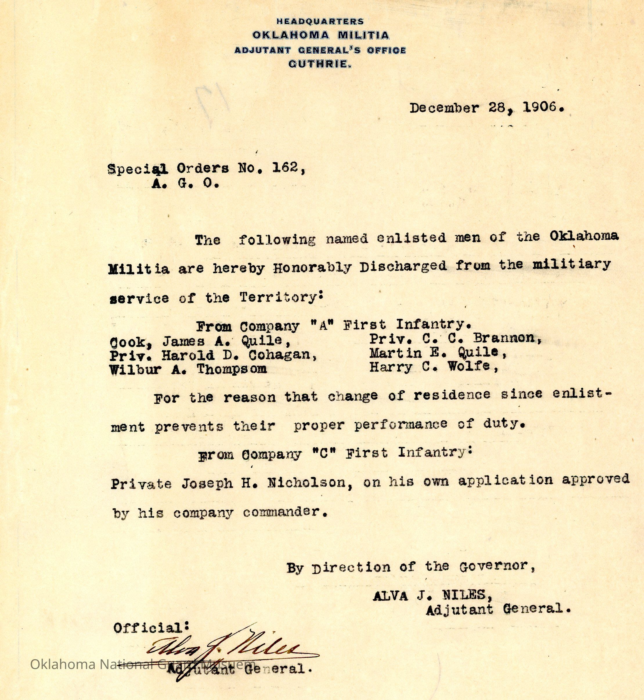 Special Order #162 from Headquarters Adjutant General's Office in Guthrie. The order lists the honorable discharges in First InfantryDate(s) of Creation