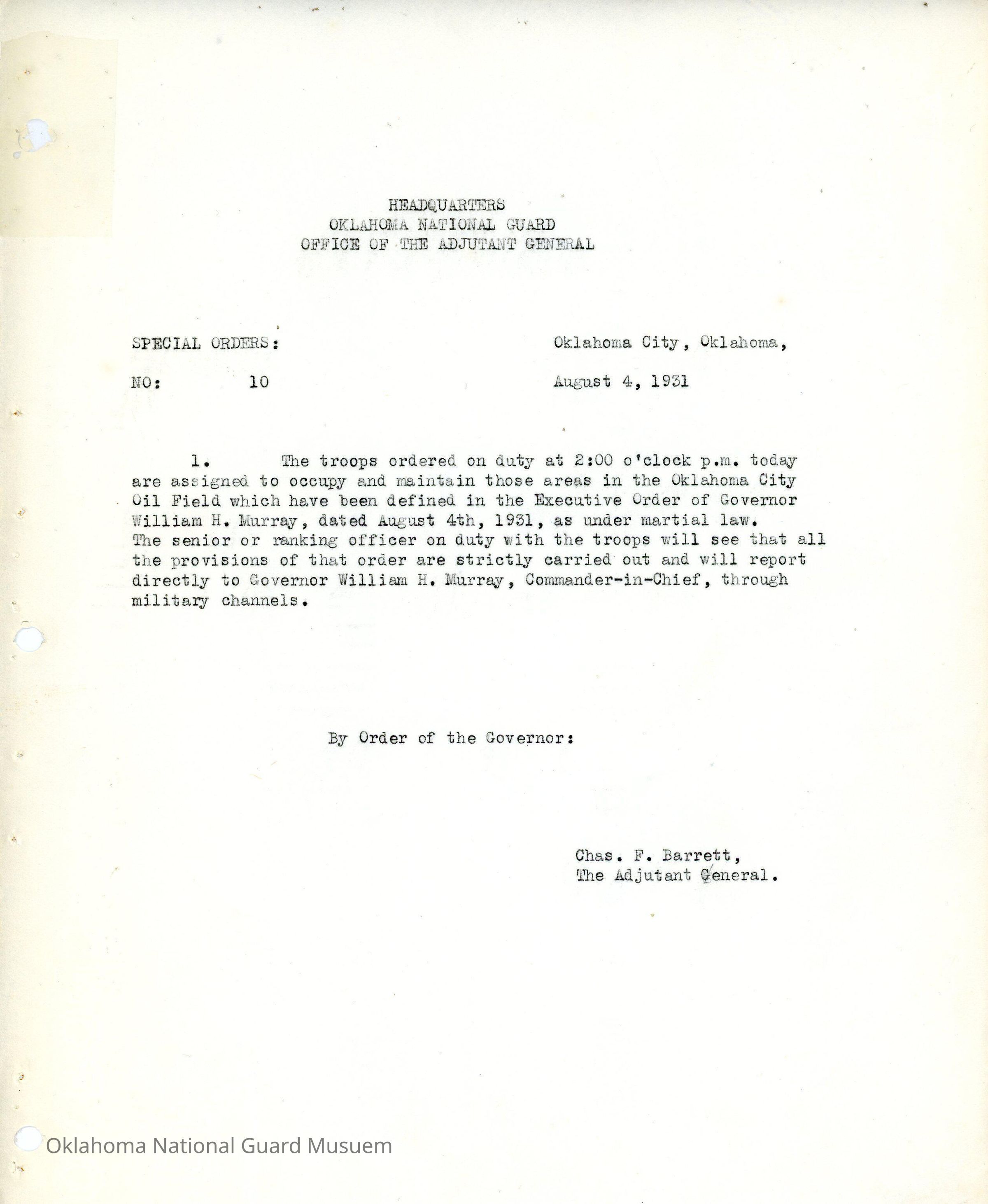 General Order #10 from Headquarters Adjutant General's Office in Oklahoma City. The order sends troops out to the area defined in an Executive Order in and around the oil fields in Oklahoma CityDate(s) of Creation