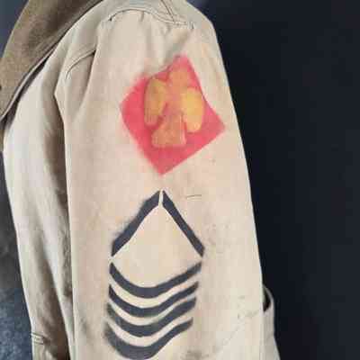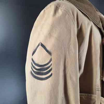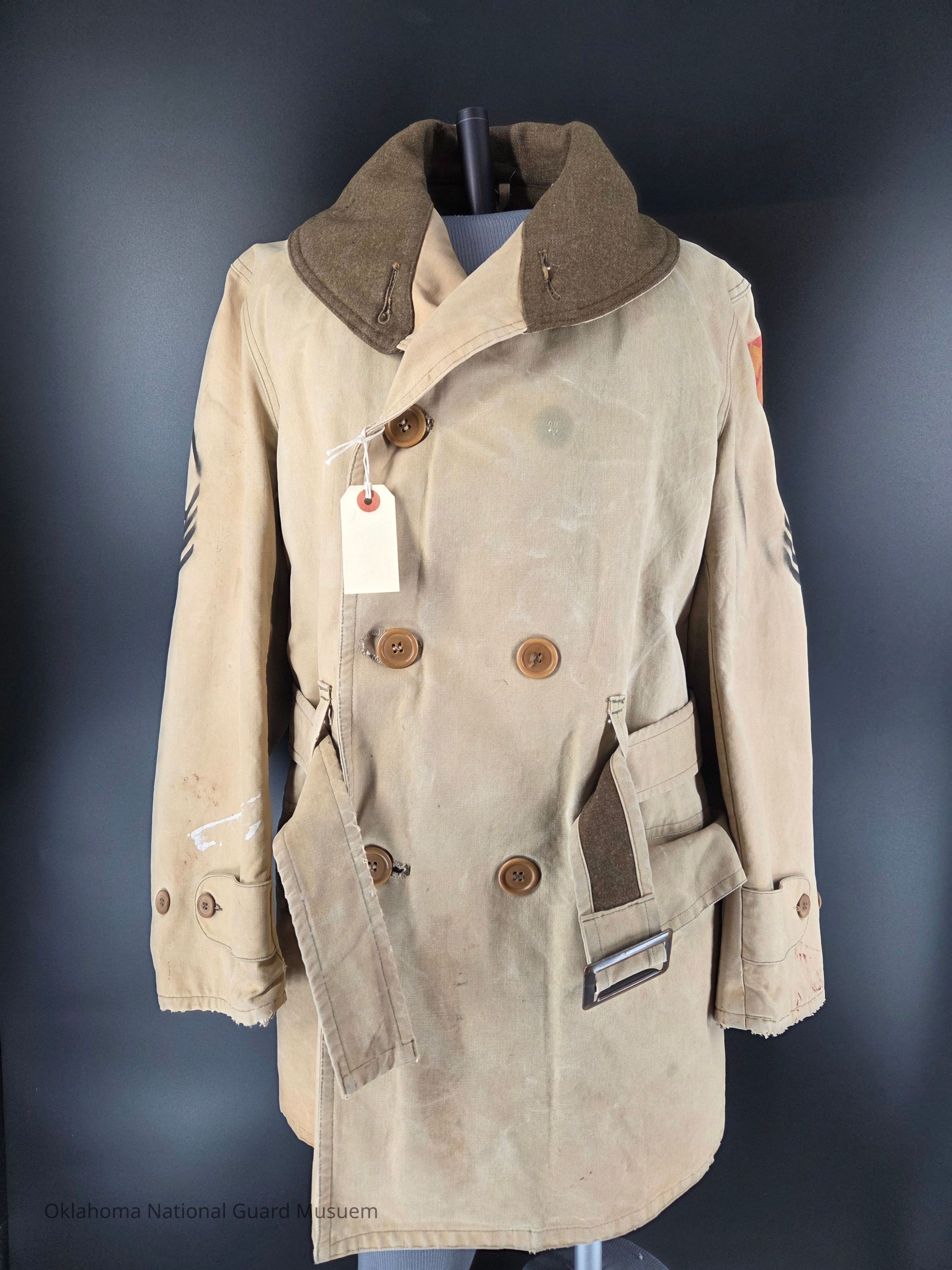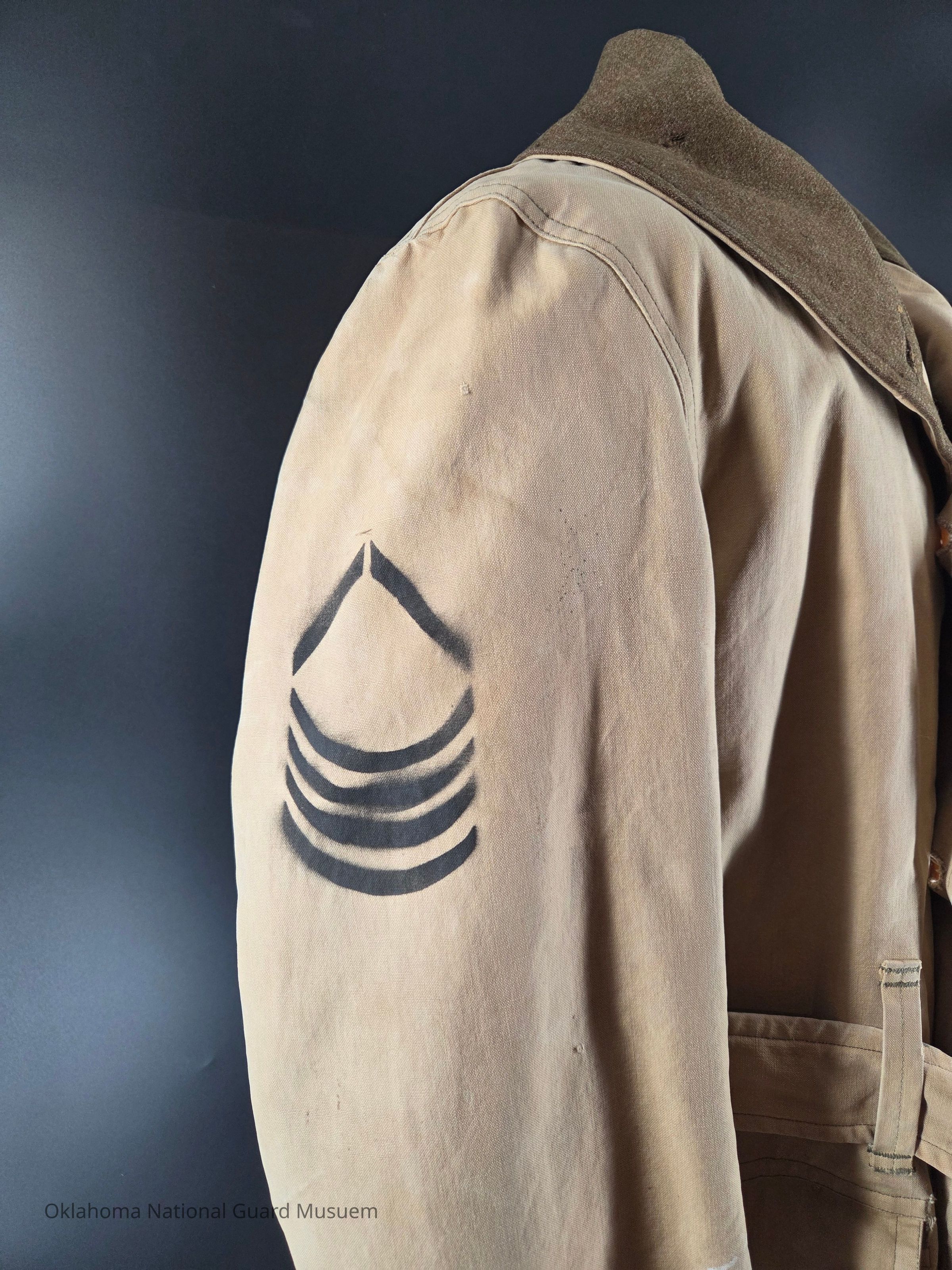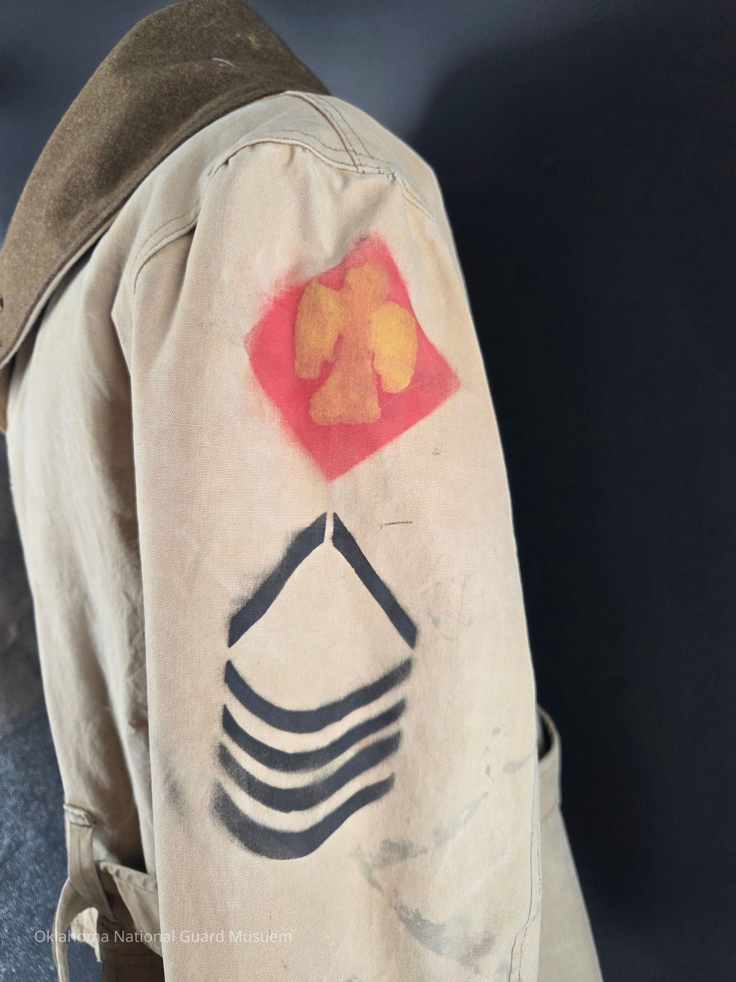 Jeep coat with stenciled rank insignia as well as a stenciled Thunderbird insignia on left shoulder. This coat was issued to J.D. Morrison (Marlow, Oklahoma) of the 45th Infantry Military Police CompanyContext
