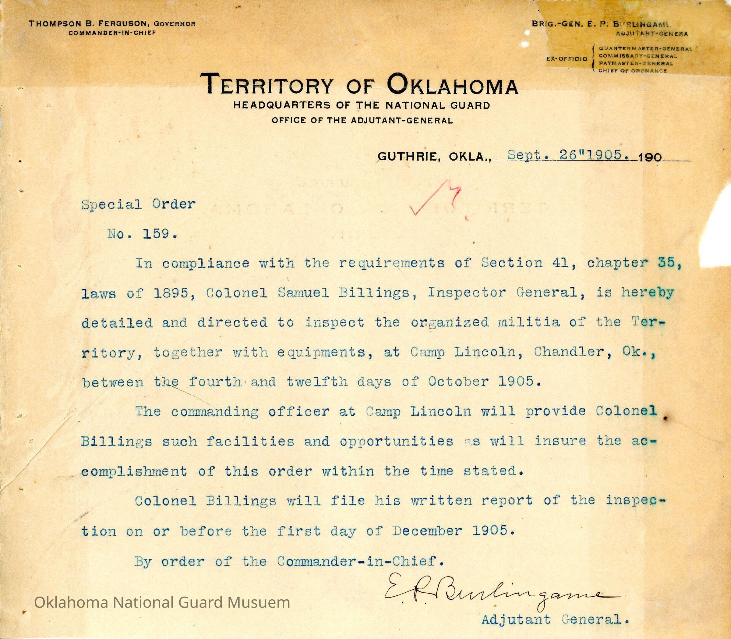 Special Order #159 from Headquarters Adjutant General's Office in Guthrie. The order instructs Samuel Billings to inspect the Oklahoma National Guard at Camp Lincoln in Chandler during the annual encampmentDate(s) of Creation