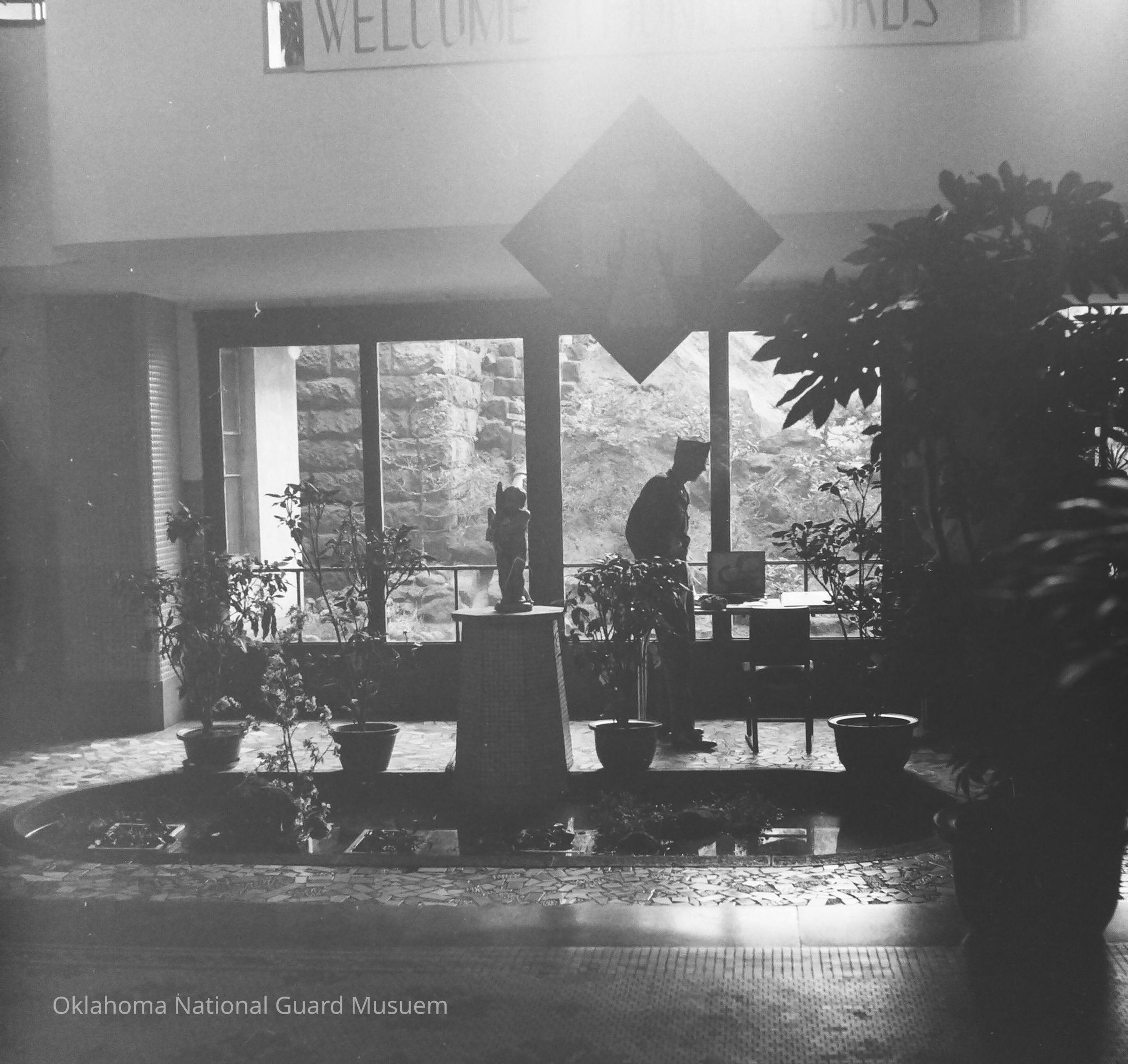 Negative of a soldier in hotel lobby with a sign "Welcome Thunderbirds"