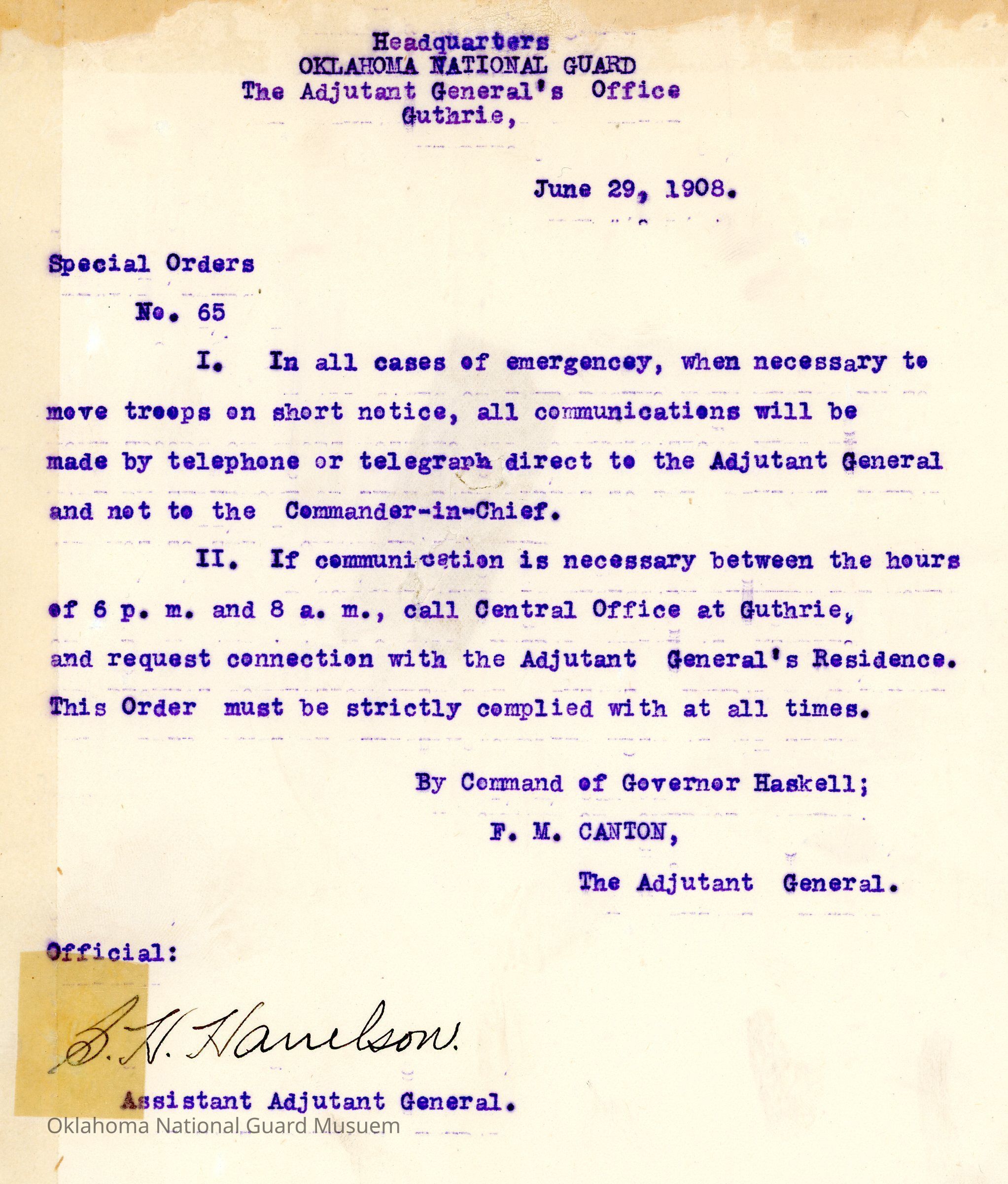Special Order #65 from Headquarters Adjutant General's Office in Guthrie. The order notes that in cases of emergency when troops need to be moved on short notice, telephone and telegraph communication directly to the Adjutant General and not the Commander-in-ChiefDate(s) of Creation