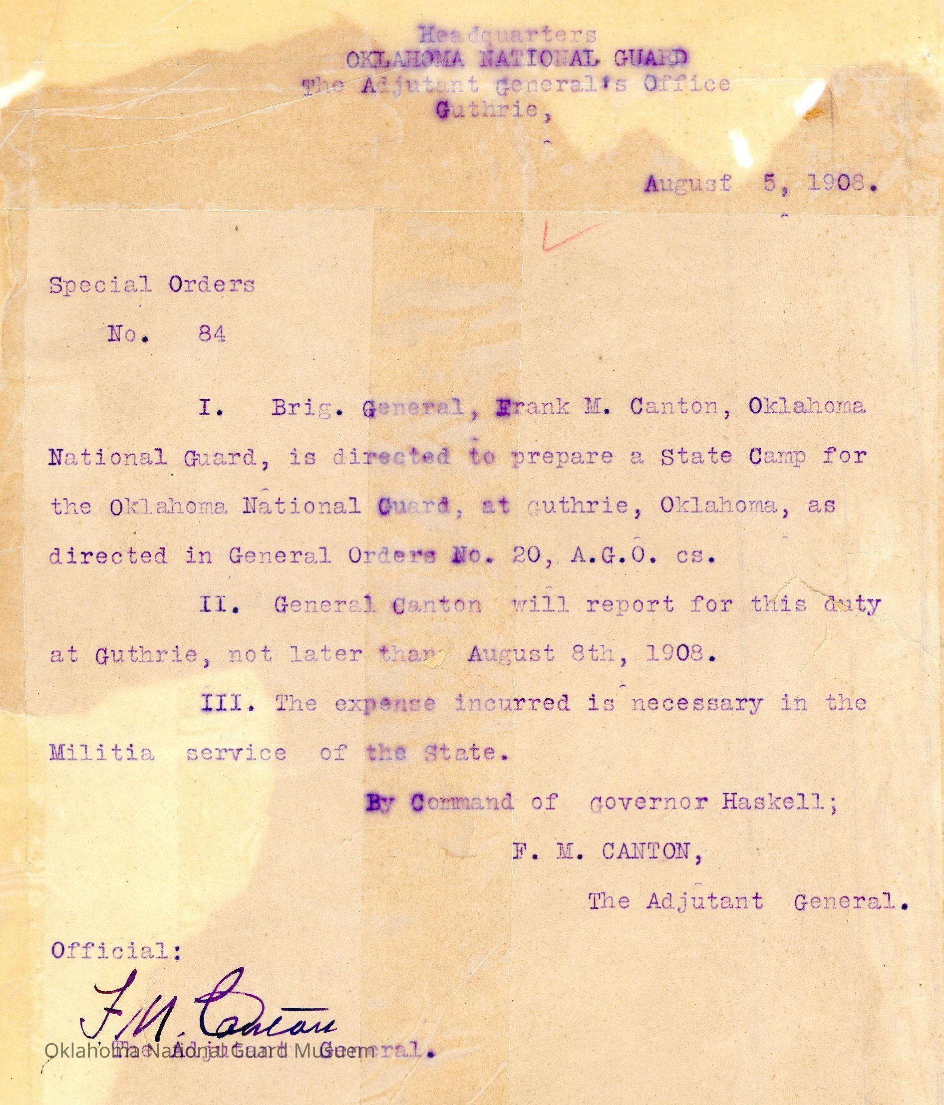 Special Order #84 from Headquarters Adjutant General's Office in Guthrie. The order instructs Frank Canton to prepare a State Camp for the Oklahoma National Guard as directed in General Order #20 1908Date(s) of Creation