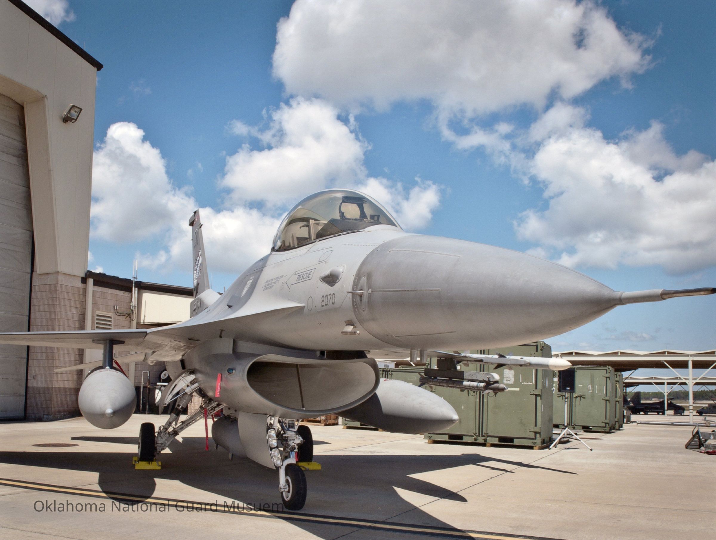 F-16 in front of the main hanger at the Tulsa Air Base. 138th Fighter Wing