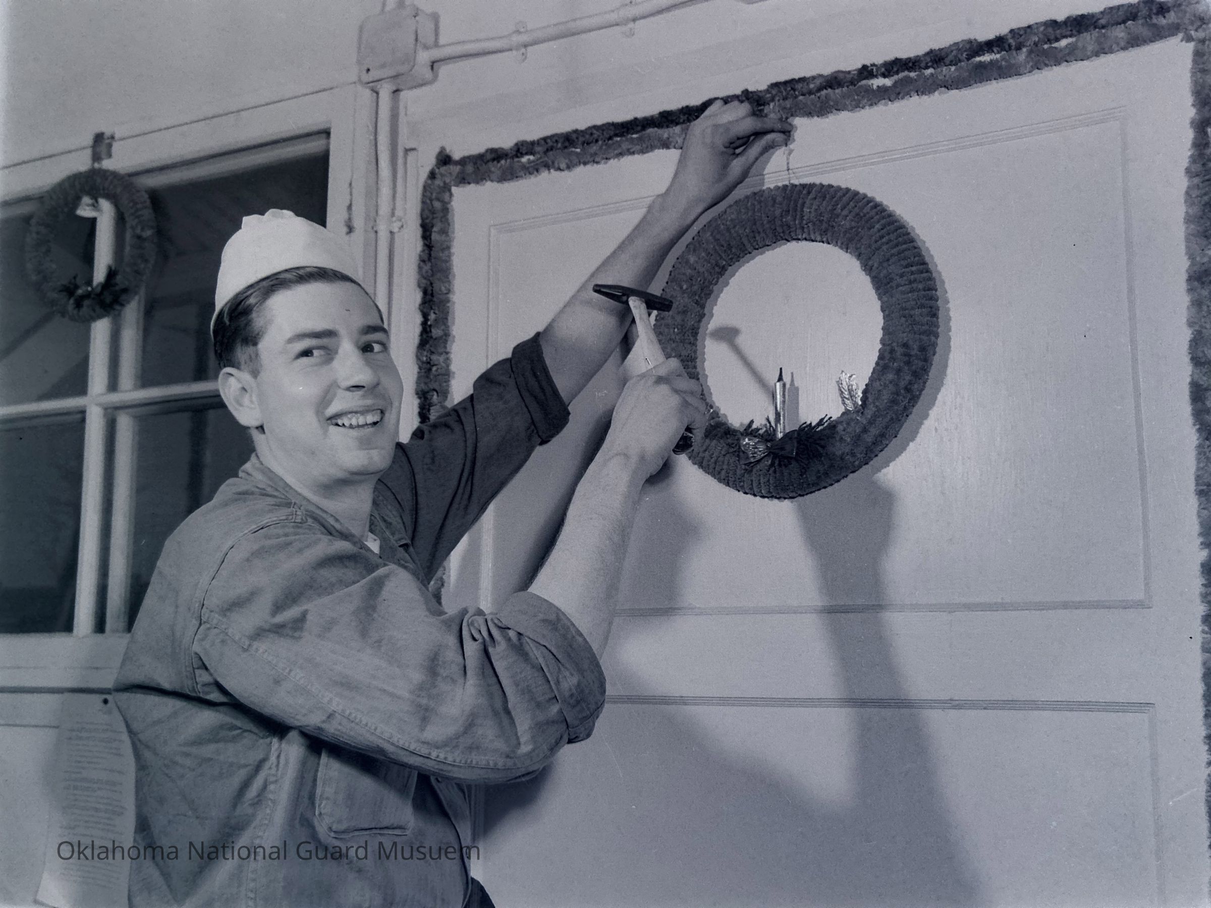 Negative of a cook hanging Christmas decorations in a mess hall on Hokkaido, Japan