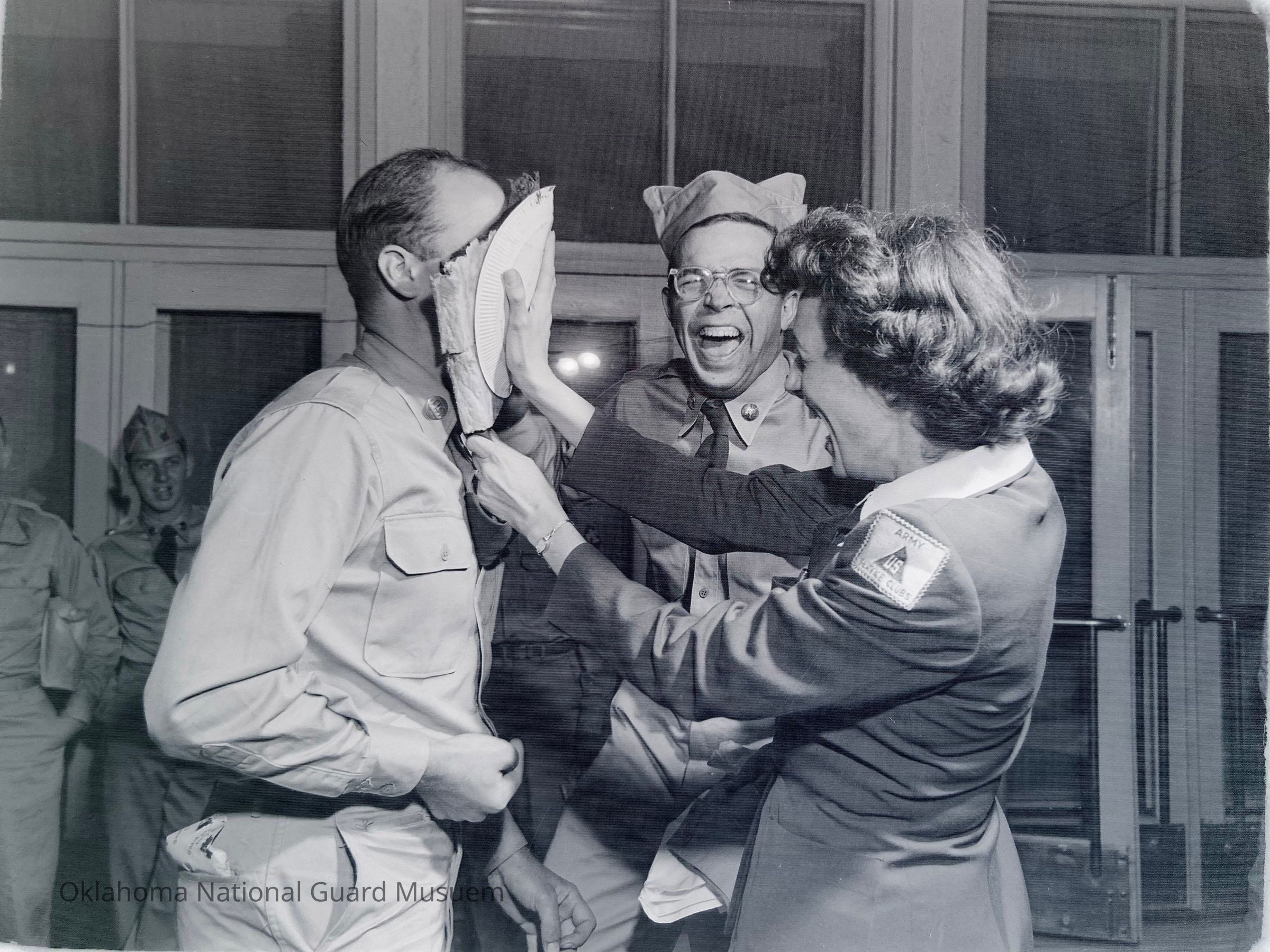 Published in 45th Division News, Hokkaido, Japan, July 12, 1951 "Here's to Real Friendship. . . PFC James Gray, Co. F, 179th Infantry, roars with delights as his buddy, CPL Marlowe Nelson, gets a chocolate pie in the face from Miss Julia Williams. Photographer Jack Gunter was there when it happened.Made/Created