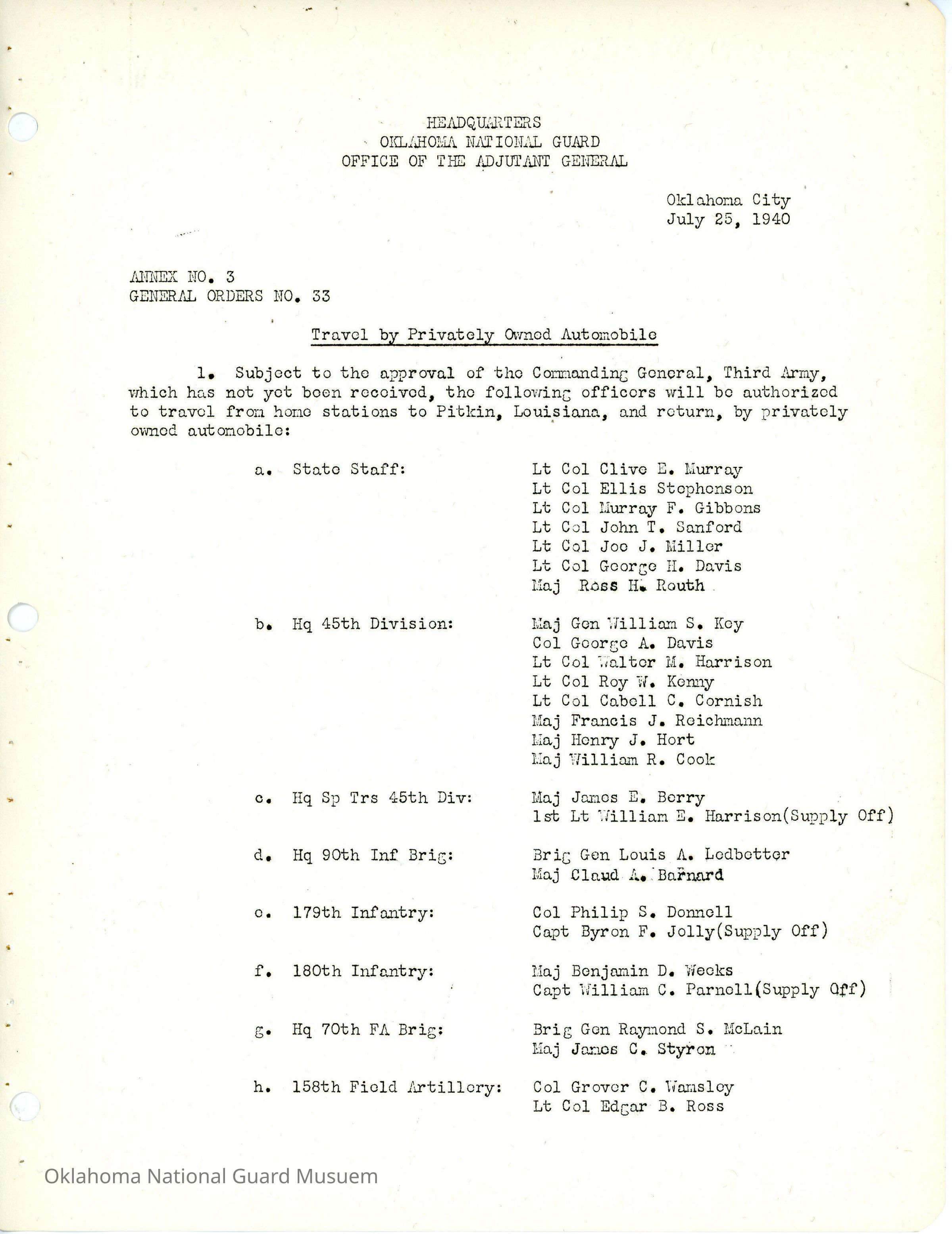 General Order #33 Annex 3 from Headquarters Adjutant General's Office in Oklahoma City. This order grants the following individuals the option to travel to Pitkin, Louisiana by personal vehicle for field trainingDate(s) of Creation
