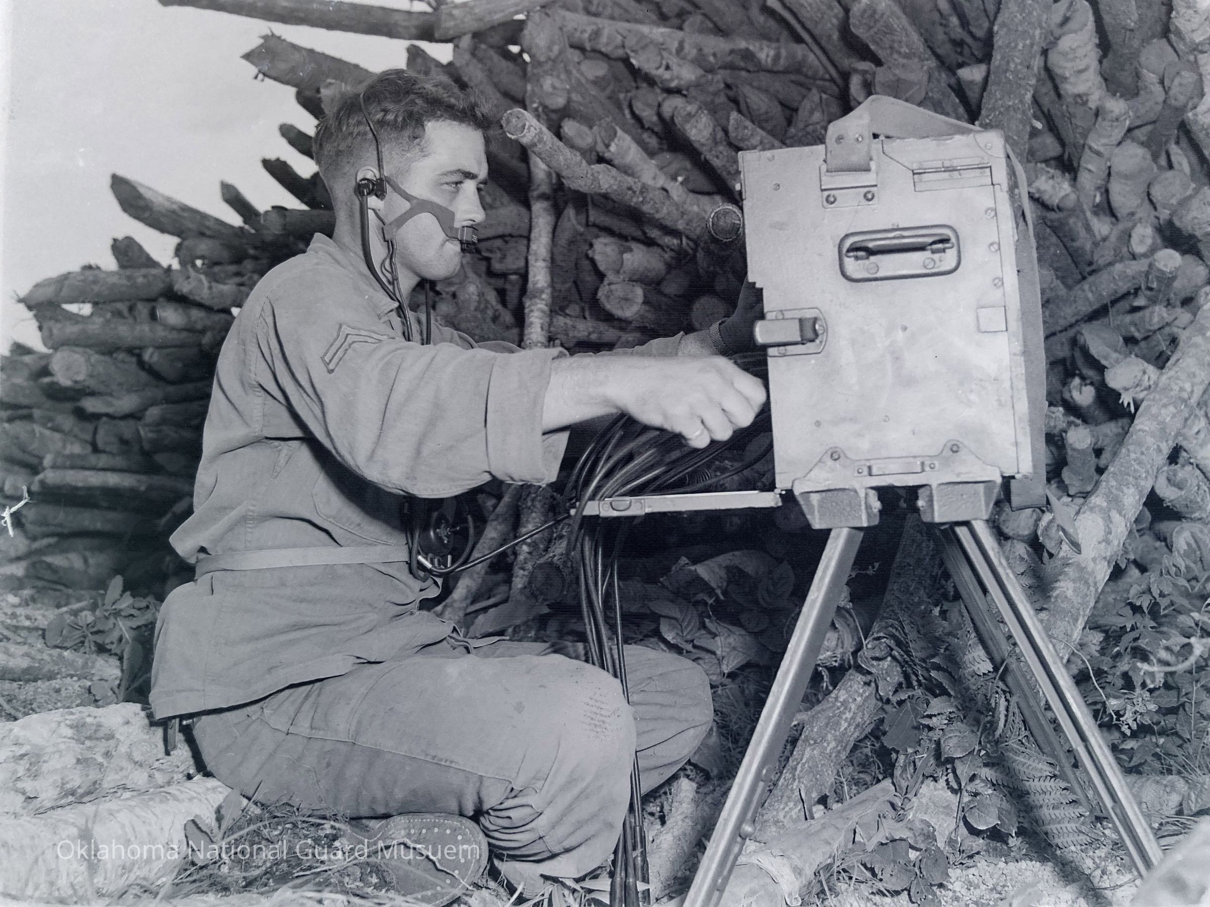 Negative of a soldier operating a telephone field switchboard on Hokkaido, Japan