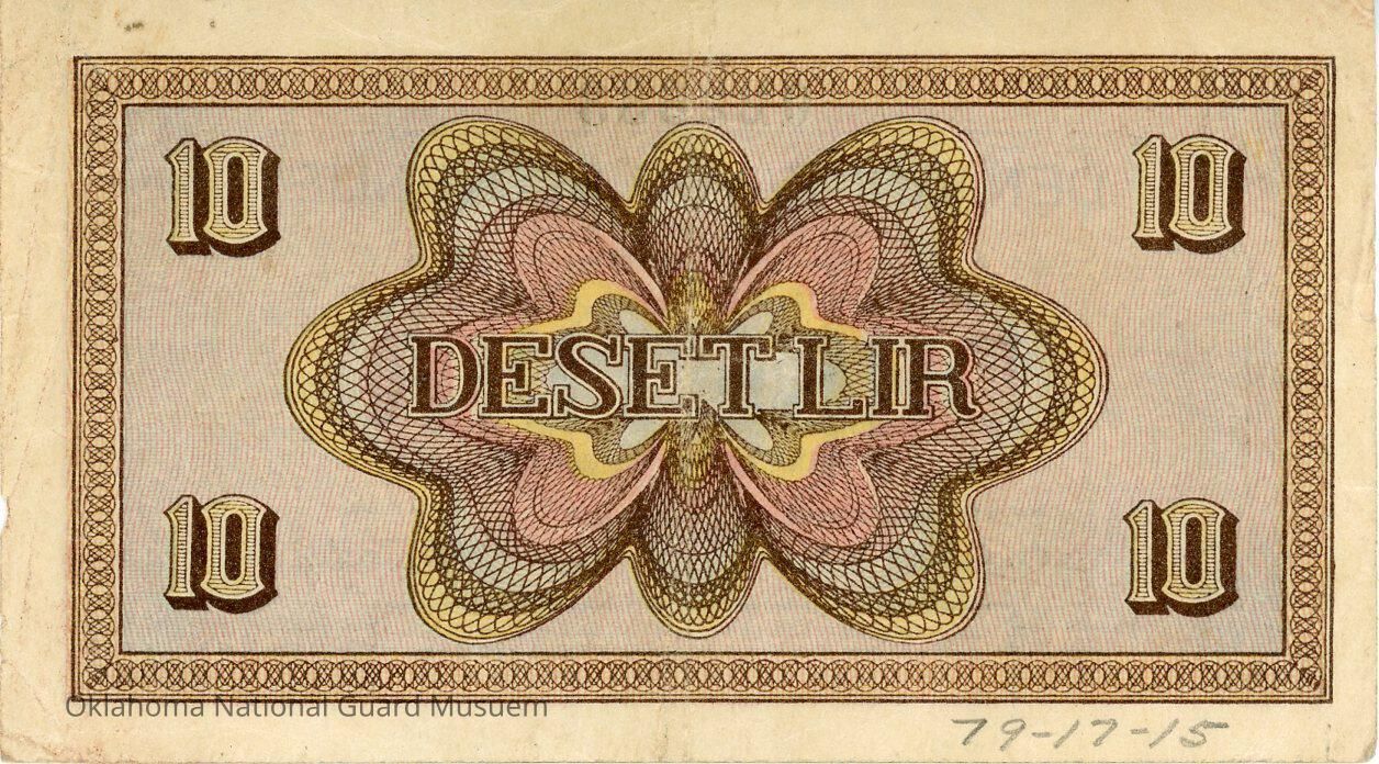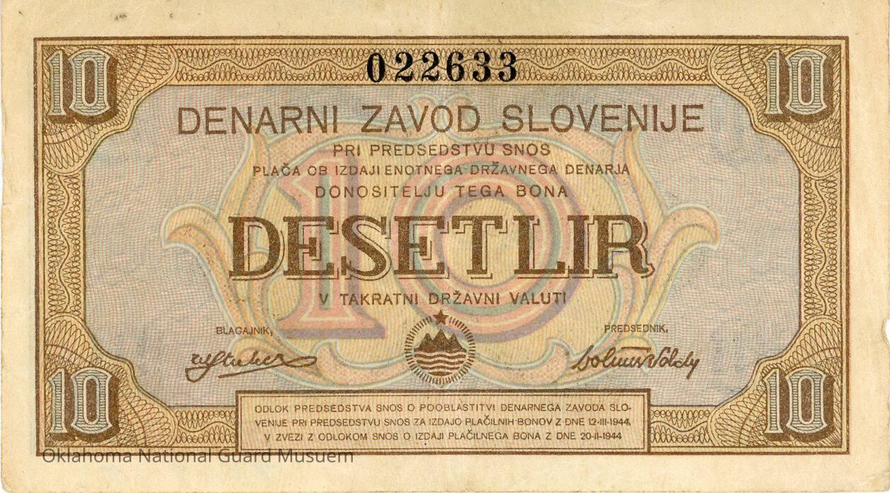 Yugoslav Partisans - Slovenia Ten Lir-1944. Accession number written on reverse in lower right corner