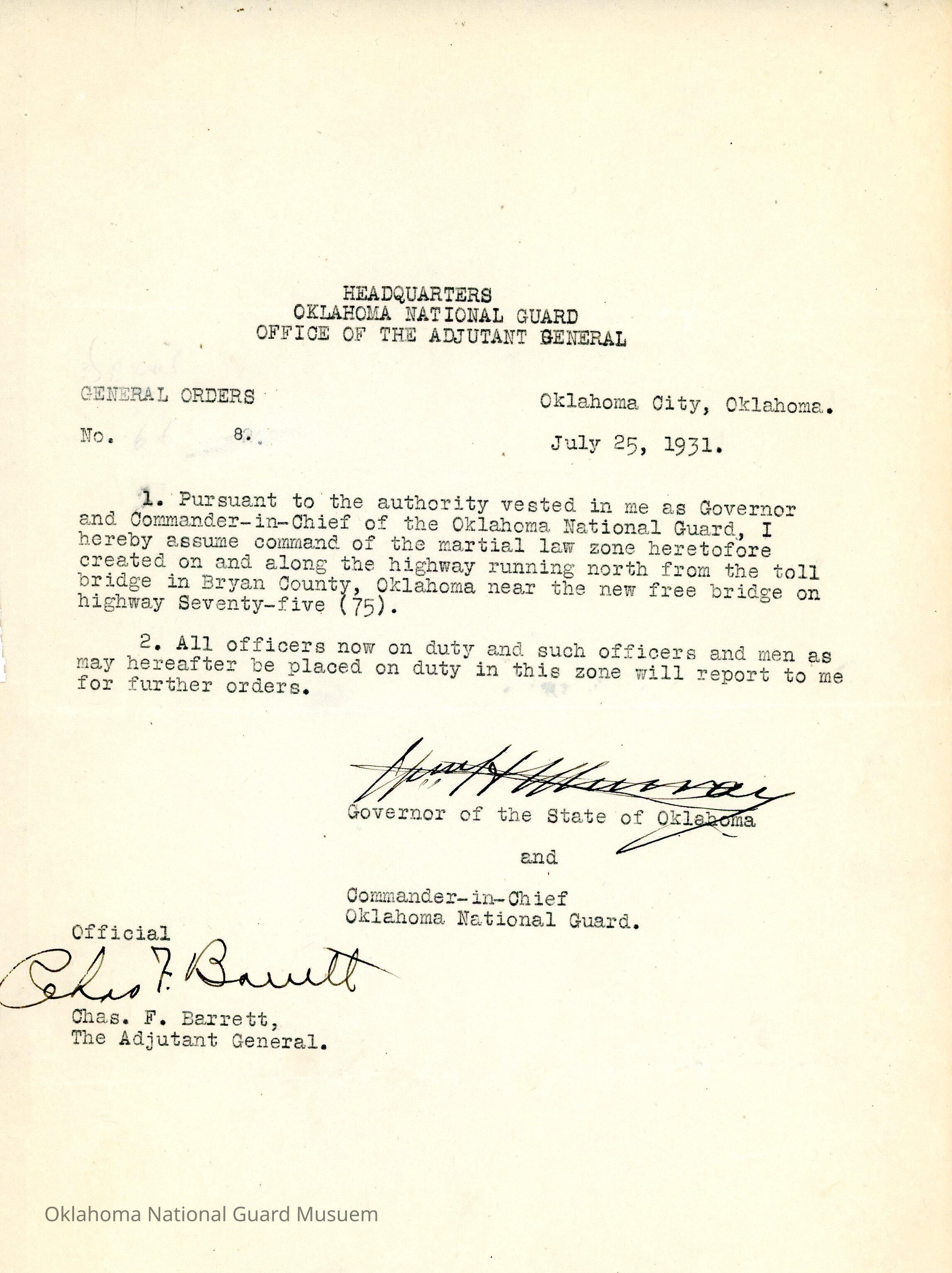 Adjutant General, Oklahoma City, Charles F. Barrett, William H. Murray, Bryan County, Martial Law