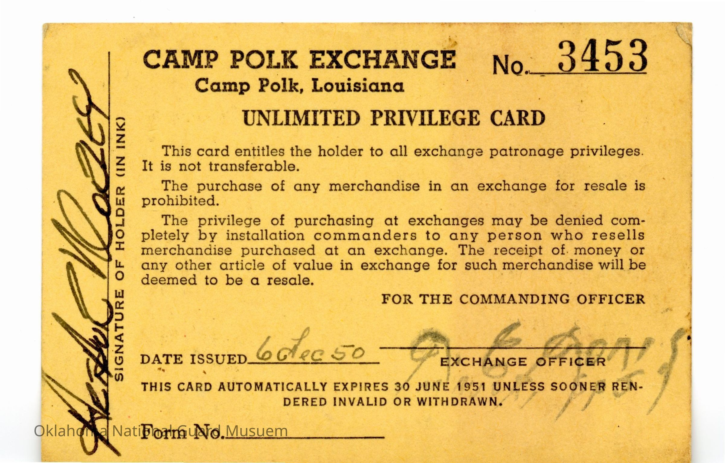 Unlimited Privilege Card for Camp Polk Exchange assigned to Arthur V. CorleyMade/Created