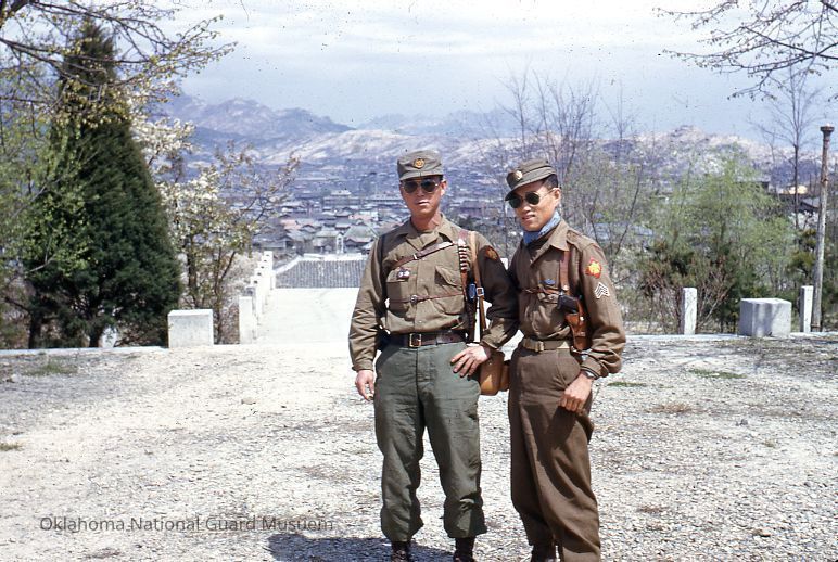 Two soldiers posing with mountains in background
