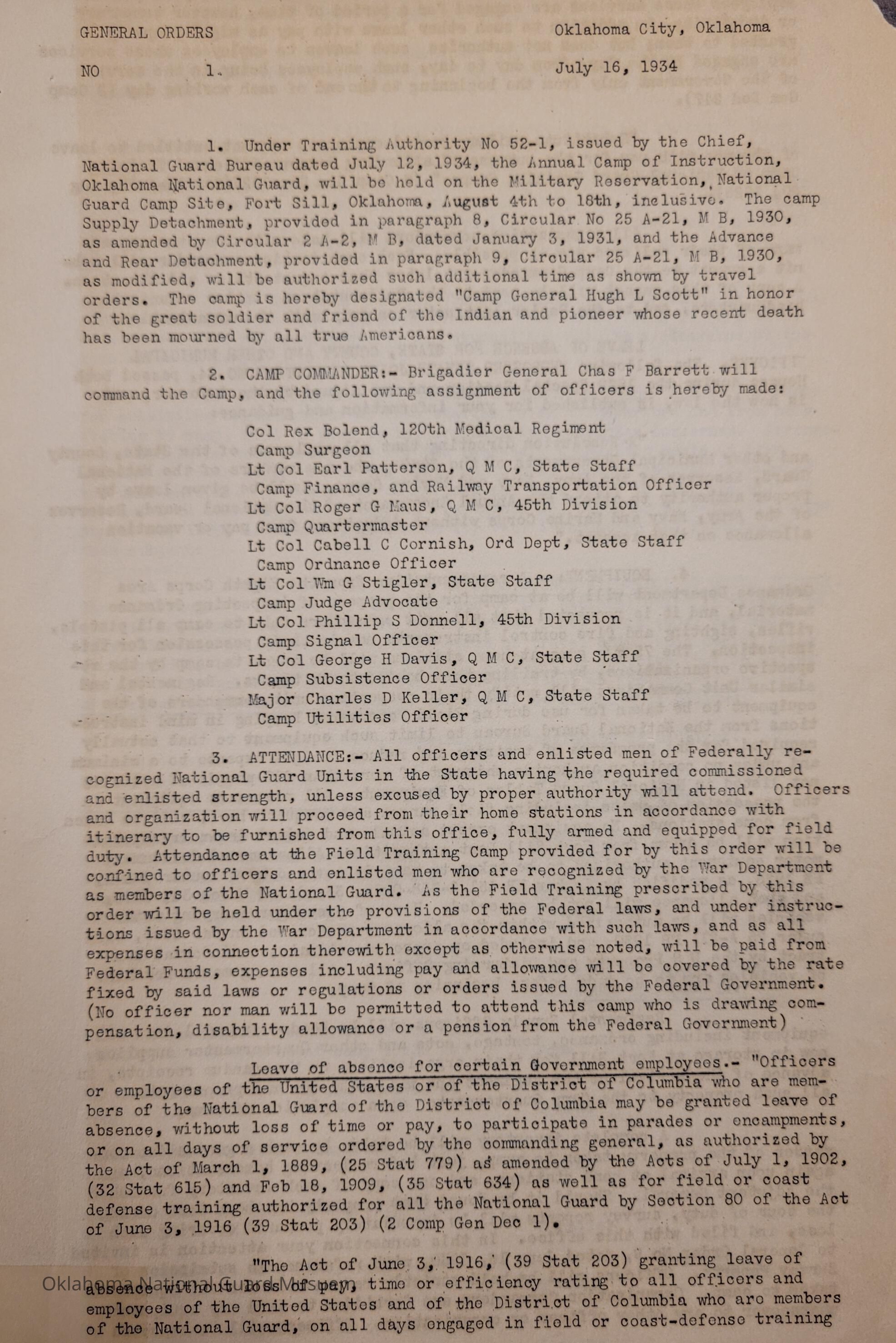 General Order #1 from Headquarters Adjutant General's Office in Oklahoma City. The order details the equipment, attendance, transportation, and pay for the Annual Camp of Instruction at Camp General Hugh L ScottDate(s) of Creation