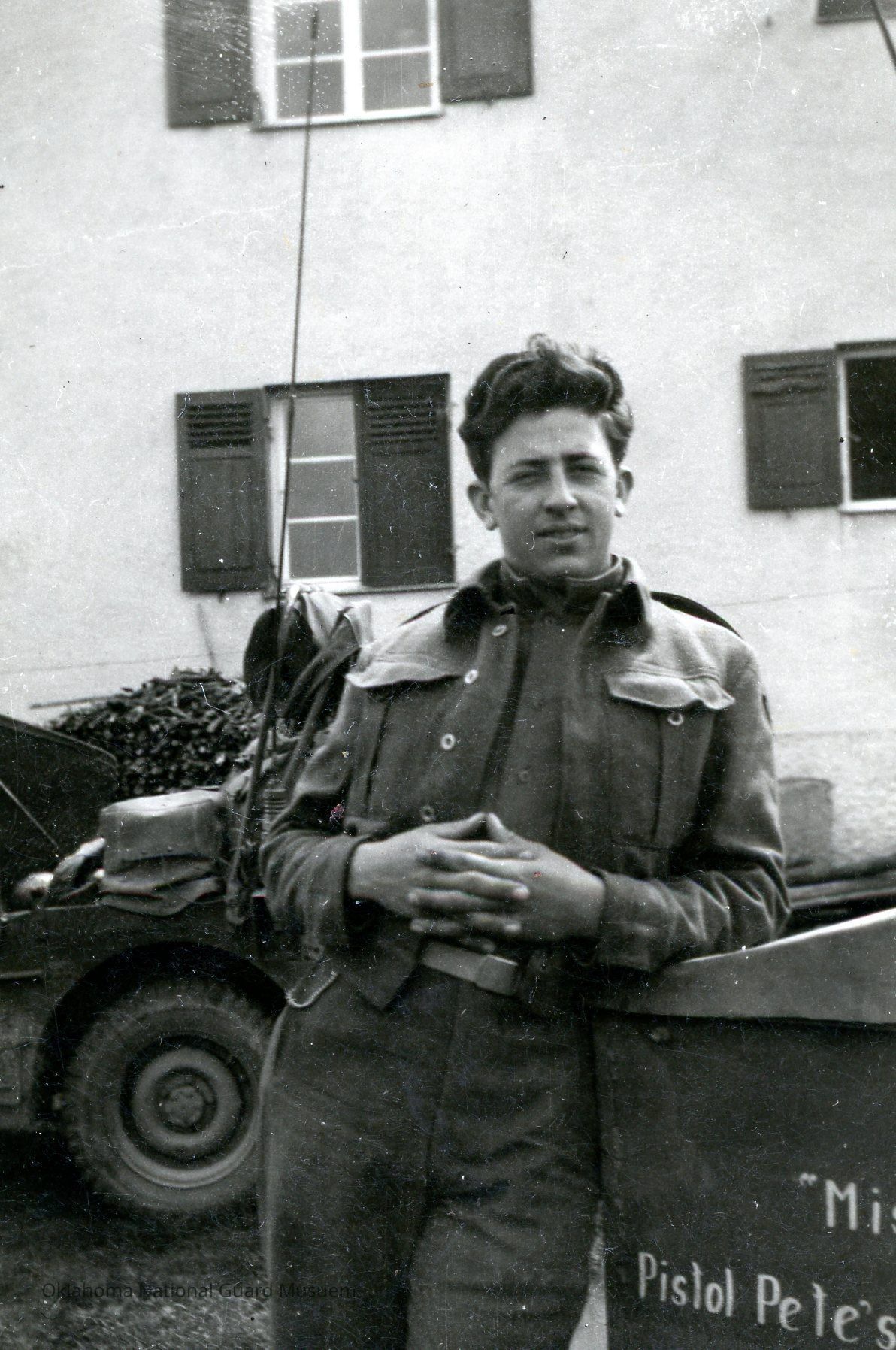 John Heinefelt leaning on a trailer Headquarters Battery 160th Field Artillery. John Embry's driver