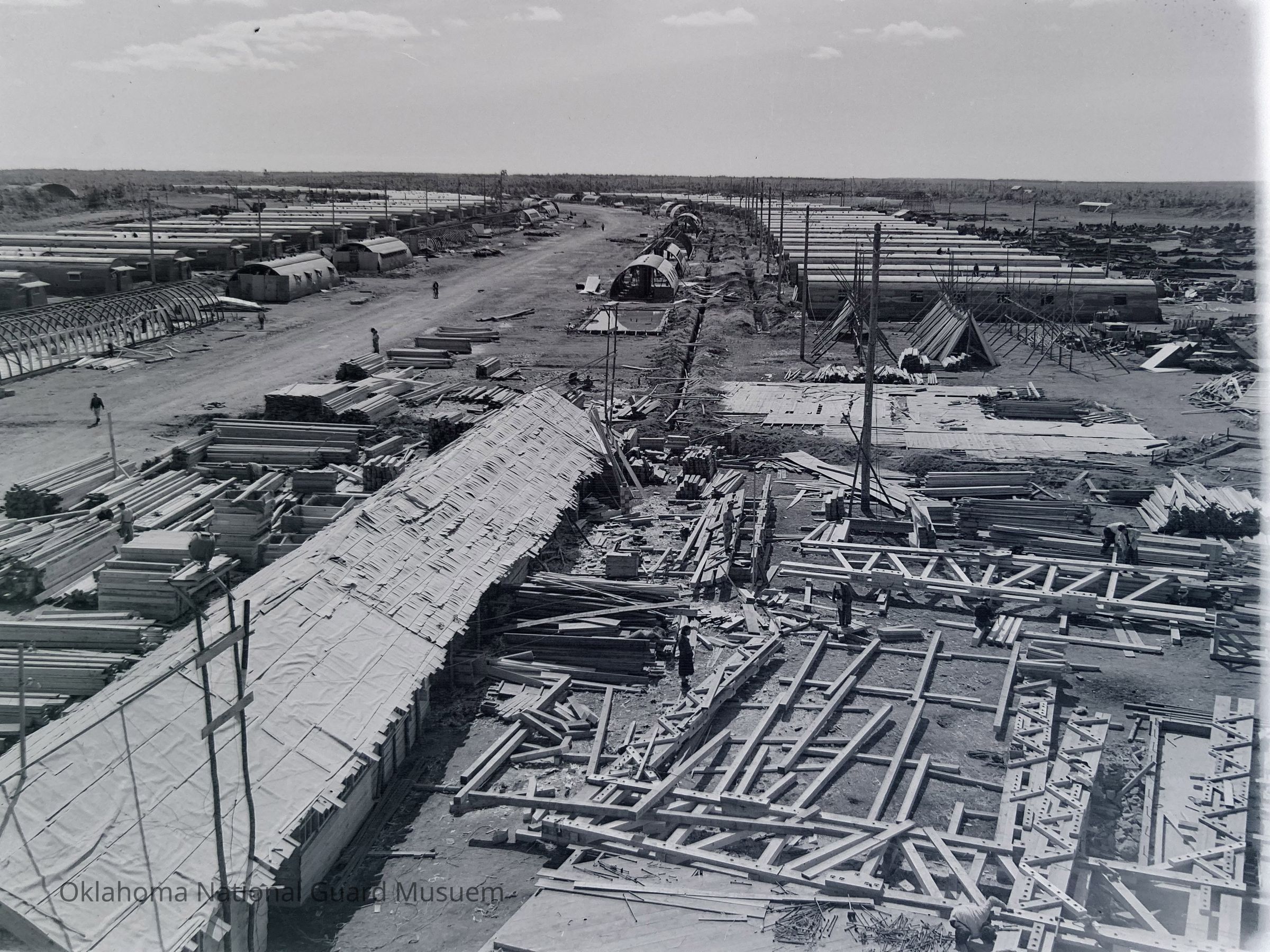 Negative of an aerial view of a Quonset hut camp area under construction on Hokkaido, Japan