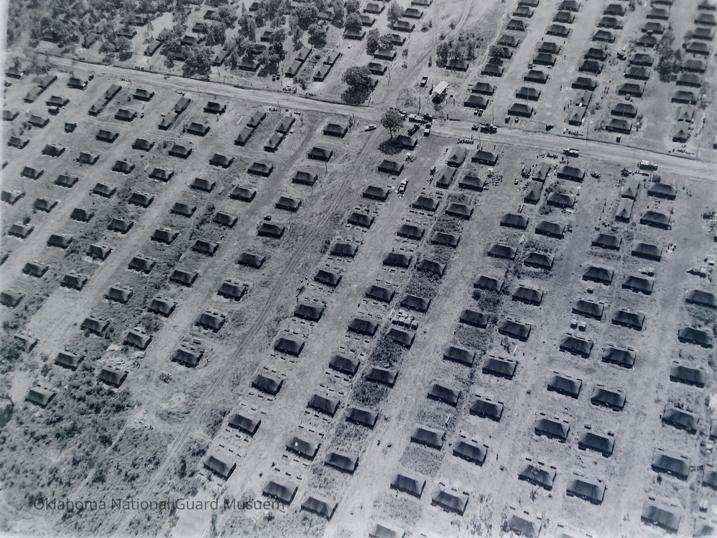 45yh Division News Vol. Vi No. 39 "Thunderbird squad tents look like giant waffle griddles to the division's light aviation fliers. This picture of camp Conrady, the 179th Regimental Combat team's tent city, was taken from 700 feet up in the air by an L-19 by Jack Gunter."