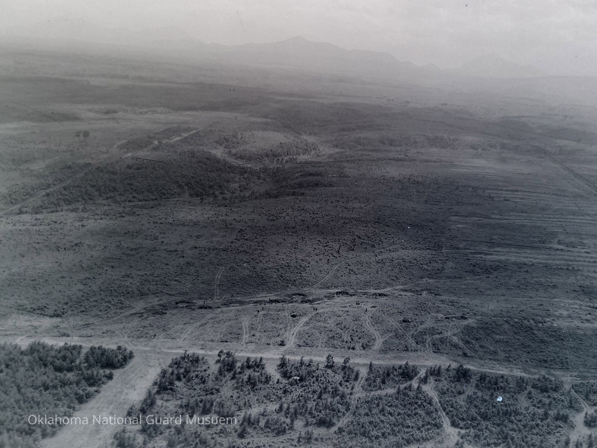 Negative of an aerial view of gun emplacements on Hokkaido, Japan
