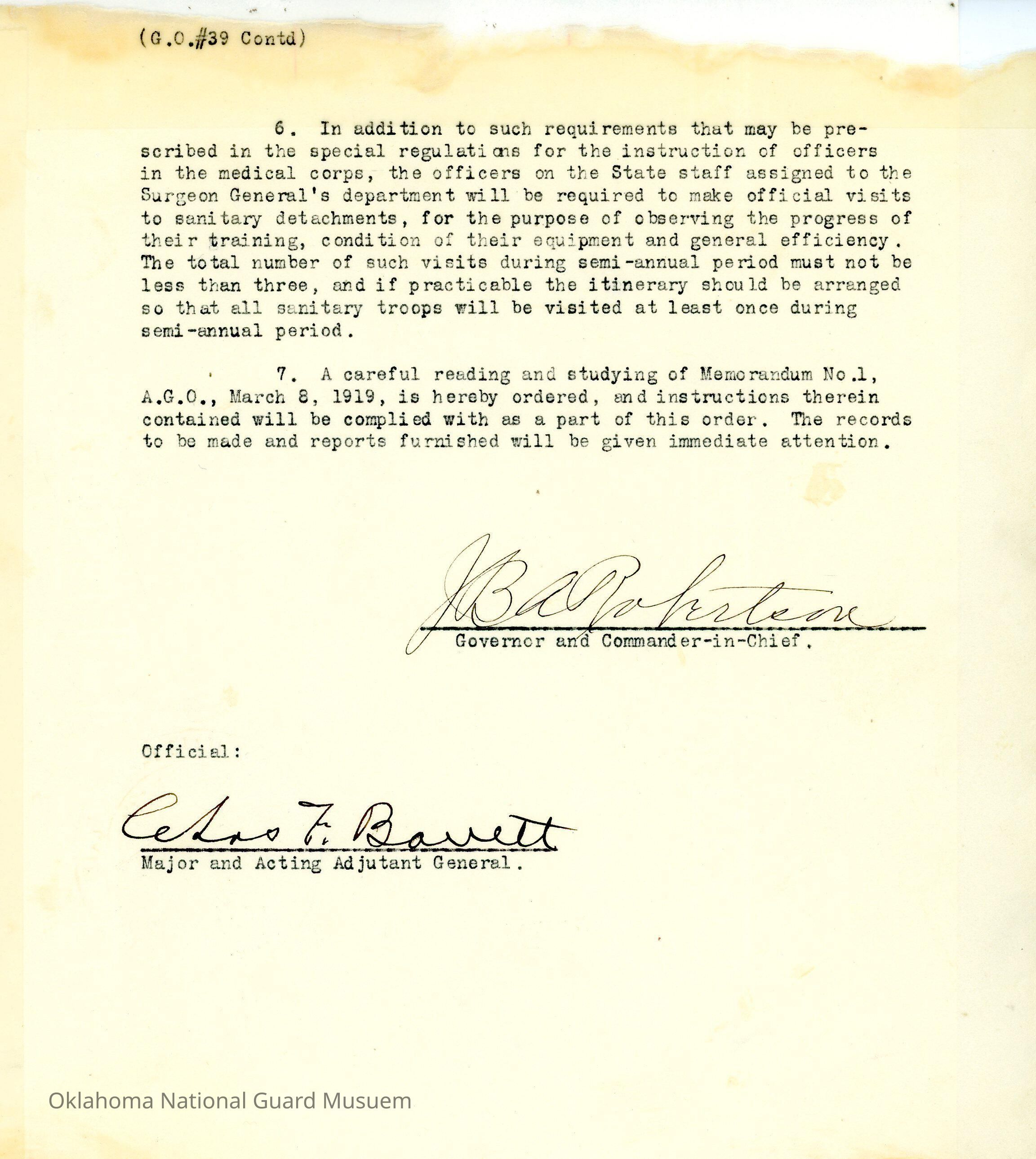 General Order #39 from Headquarters Adjutant General's Office in Oklahoma City. The order requires staff and field officers to attend assemblies and drills with the same regularity as officers of the local unit they are attached to in order to comply with the National Defense Act and the Militia Bureau.Date(s) of Creation
