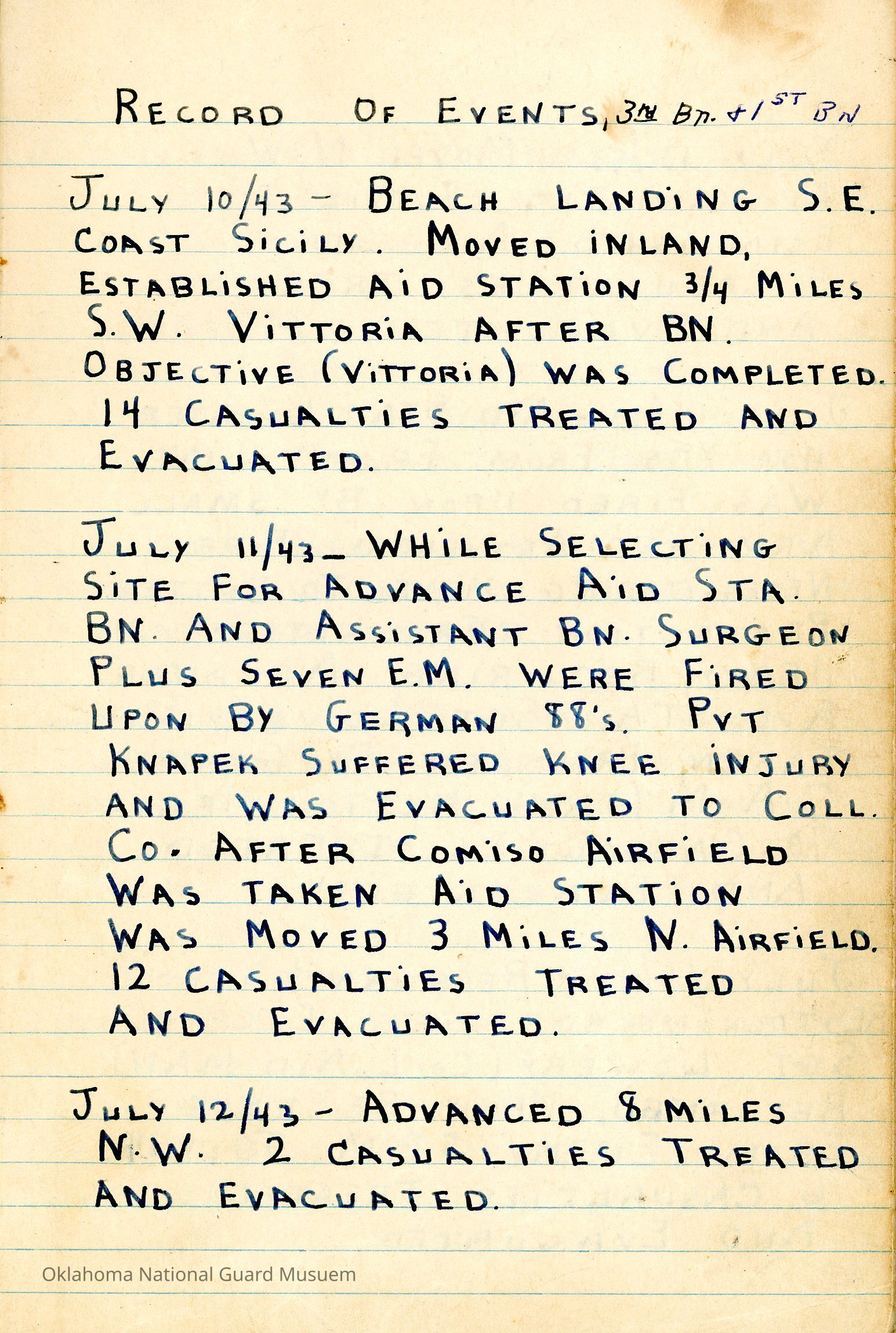 First Battalion 179th Infantry aid station dairy written by R.T. Drinkwater. Transcription of diary attached.