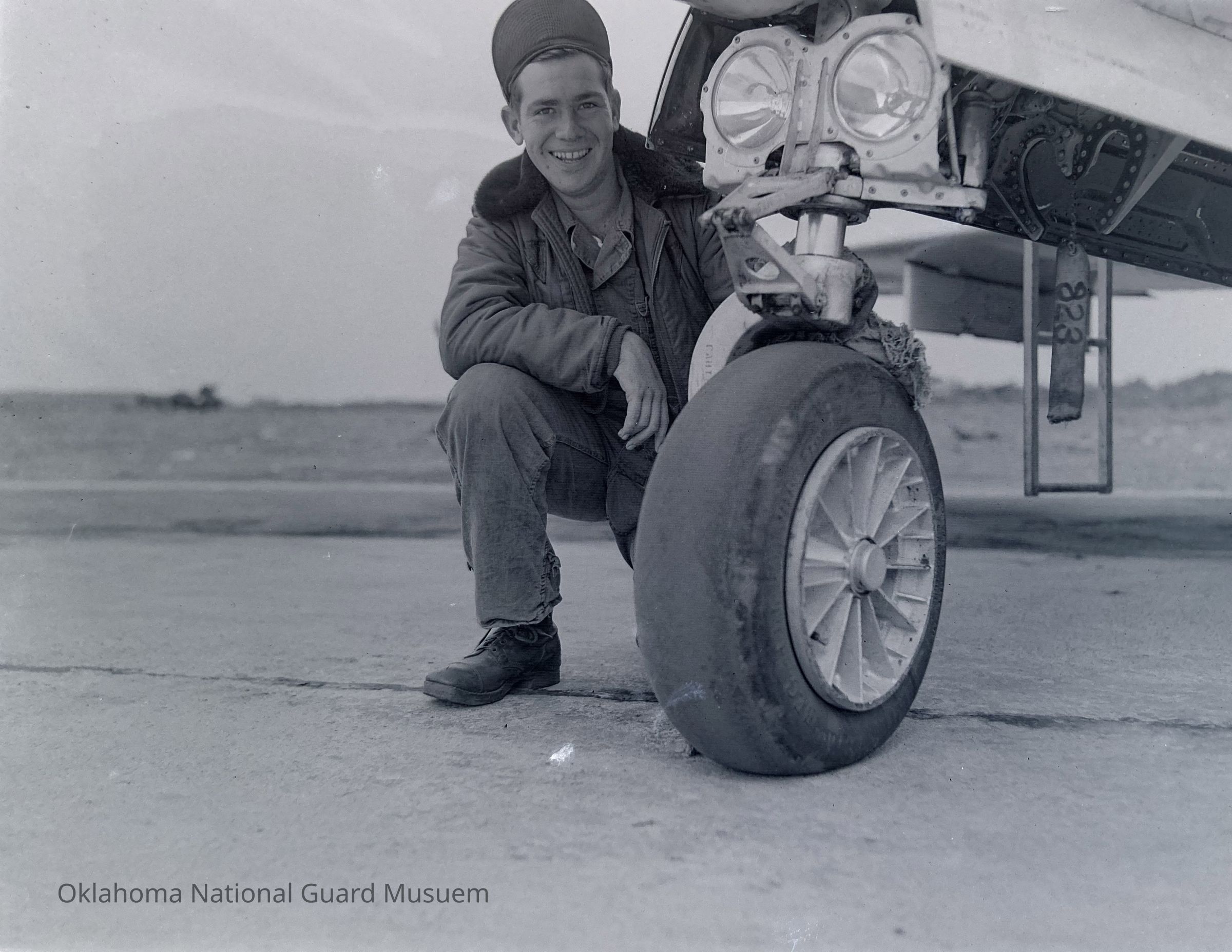 Negative of an Air Force airman examining nose wheel of an aircraft on Hokkaido, Japan
