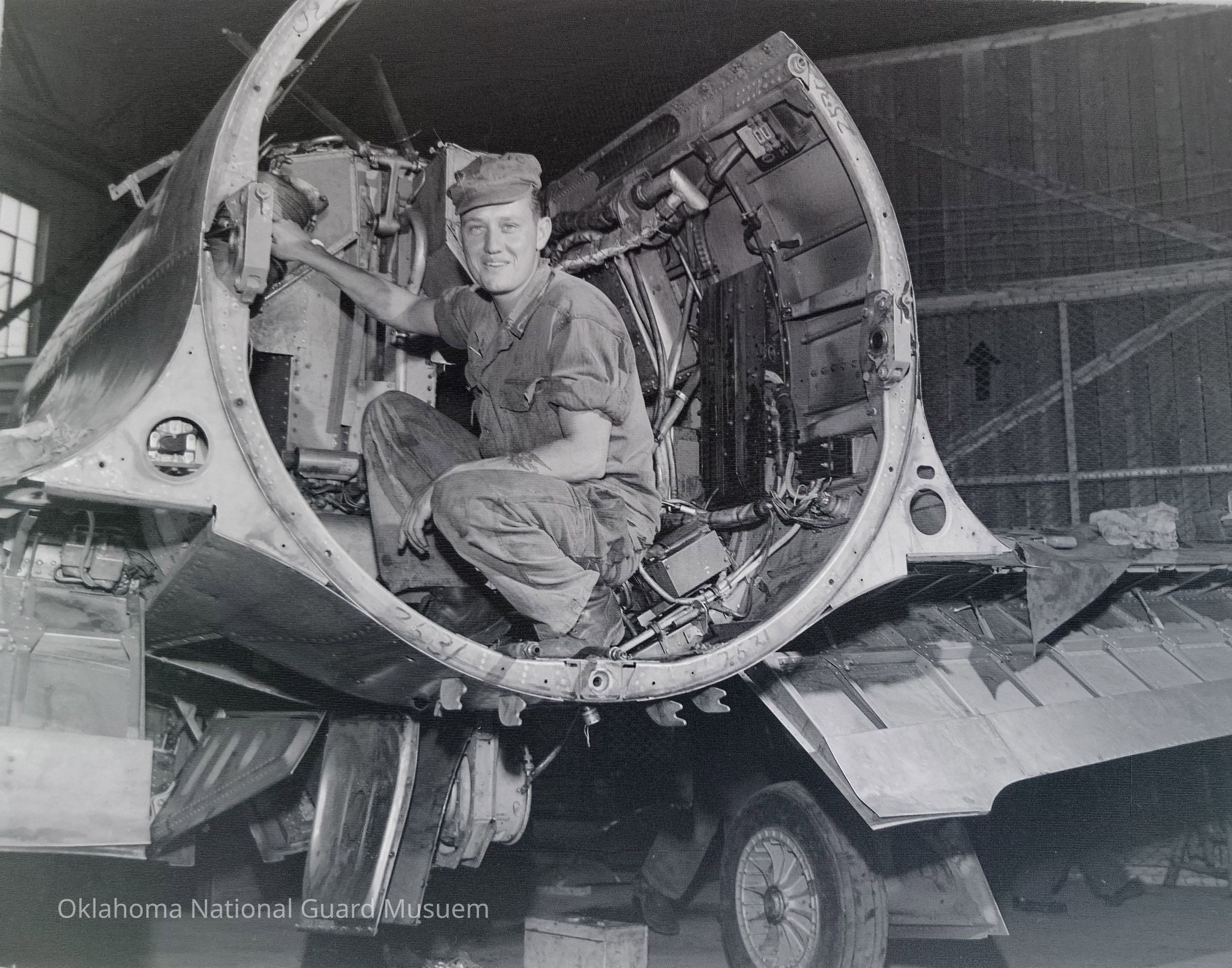 Negative of Air Force mechanic inside an aircraft fuselage on Hokkaido, Japan.