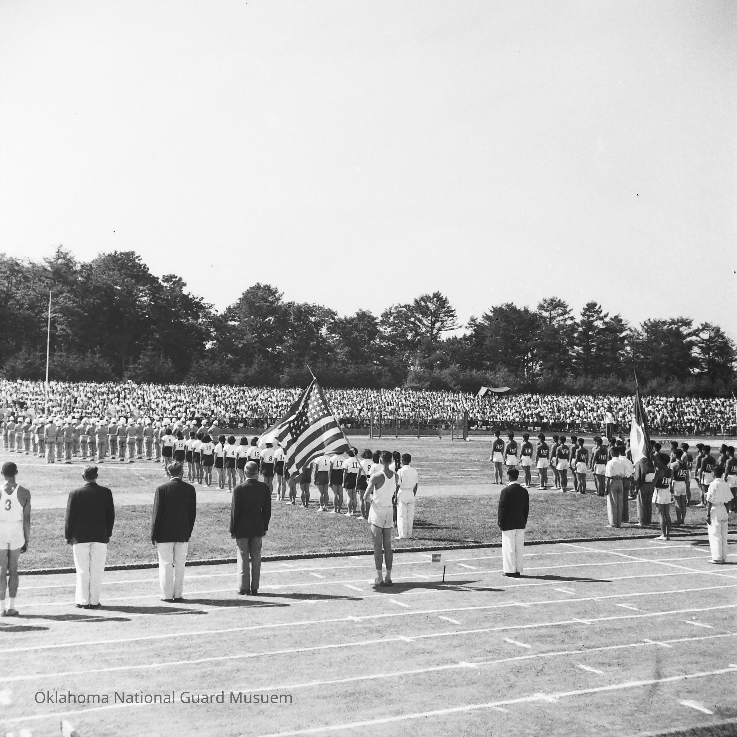 Negative of American and Japanese track athletes at ceremony